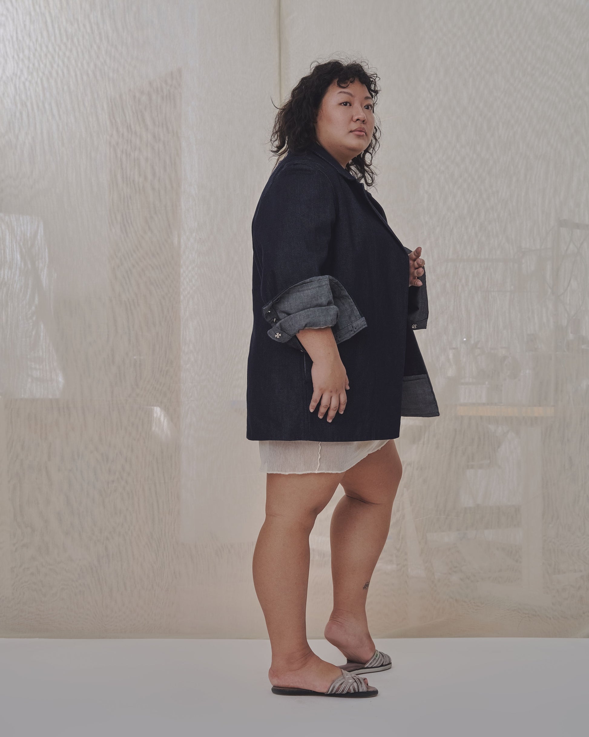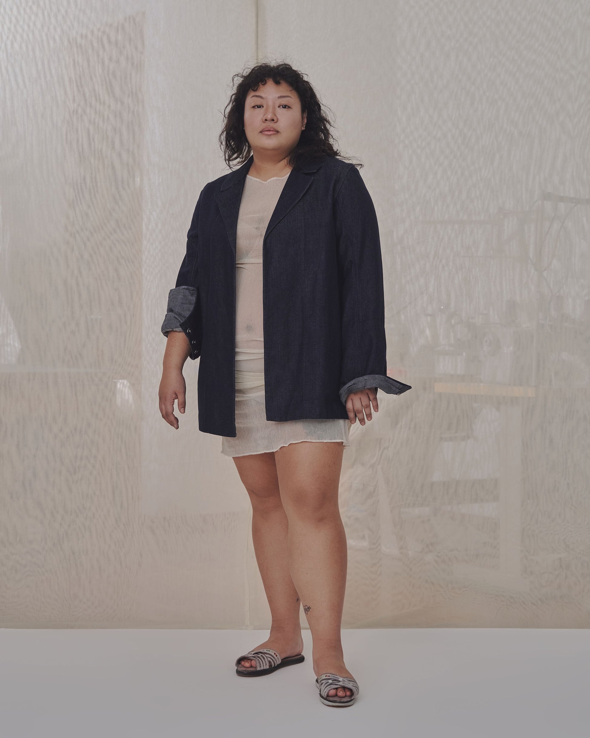Tailored blazer in Edition 0 lined with chambray featuring adjustable cuffs with snap closures completed with a center back slit.