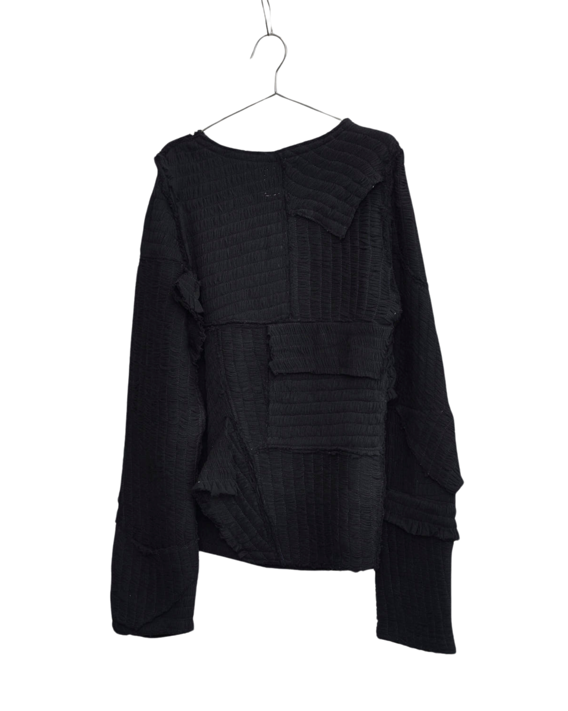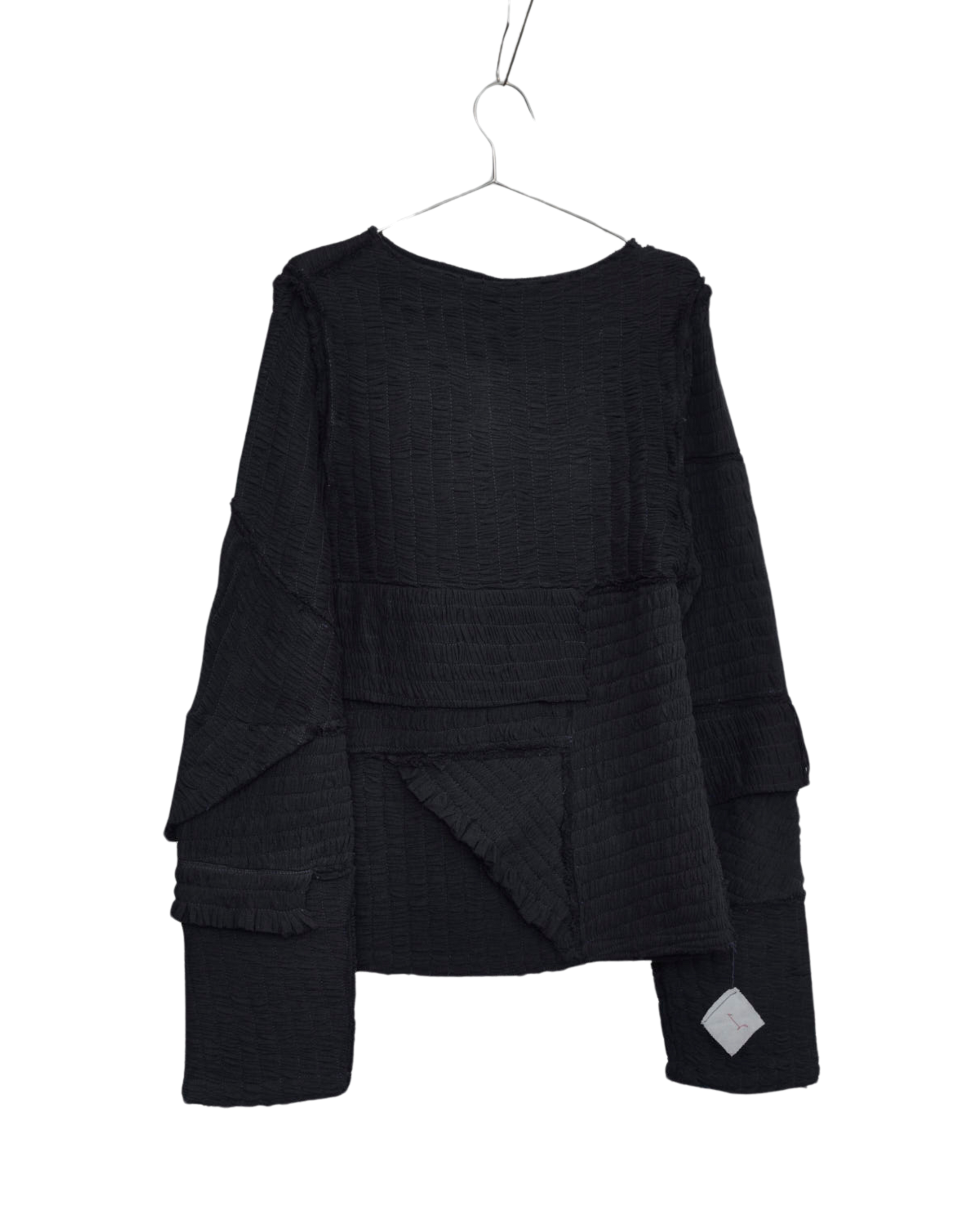 A boat neck long-sleeve shirt with detachable sleeves in ruched and pressed pique. Sleeves are detachable through snap closures.