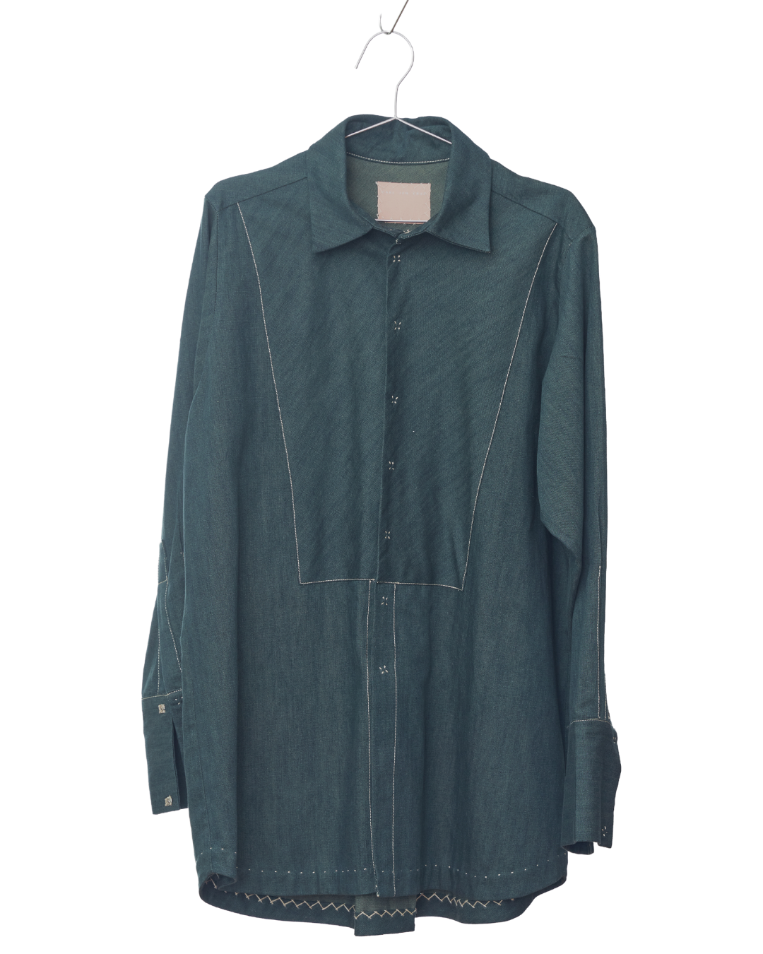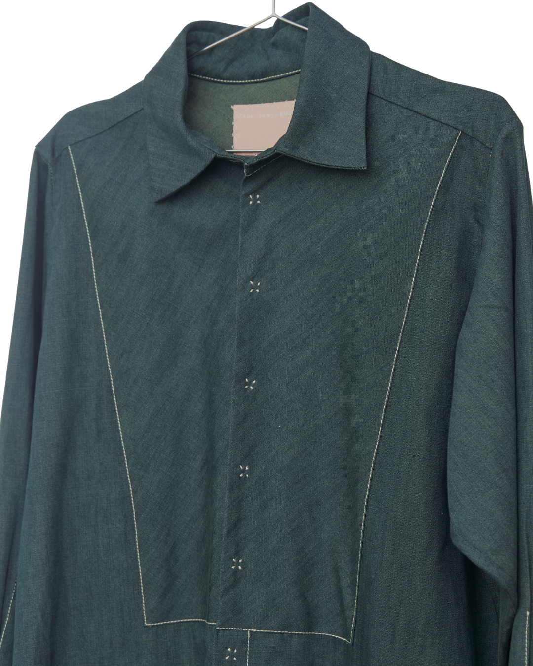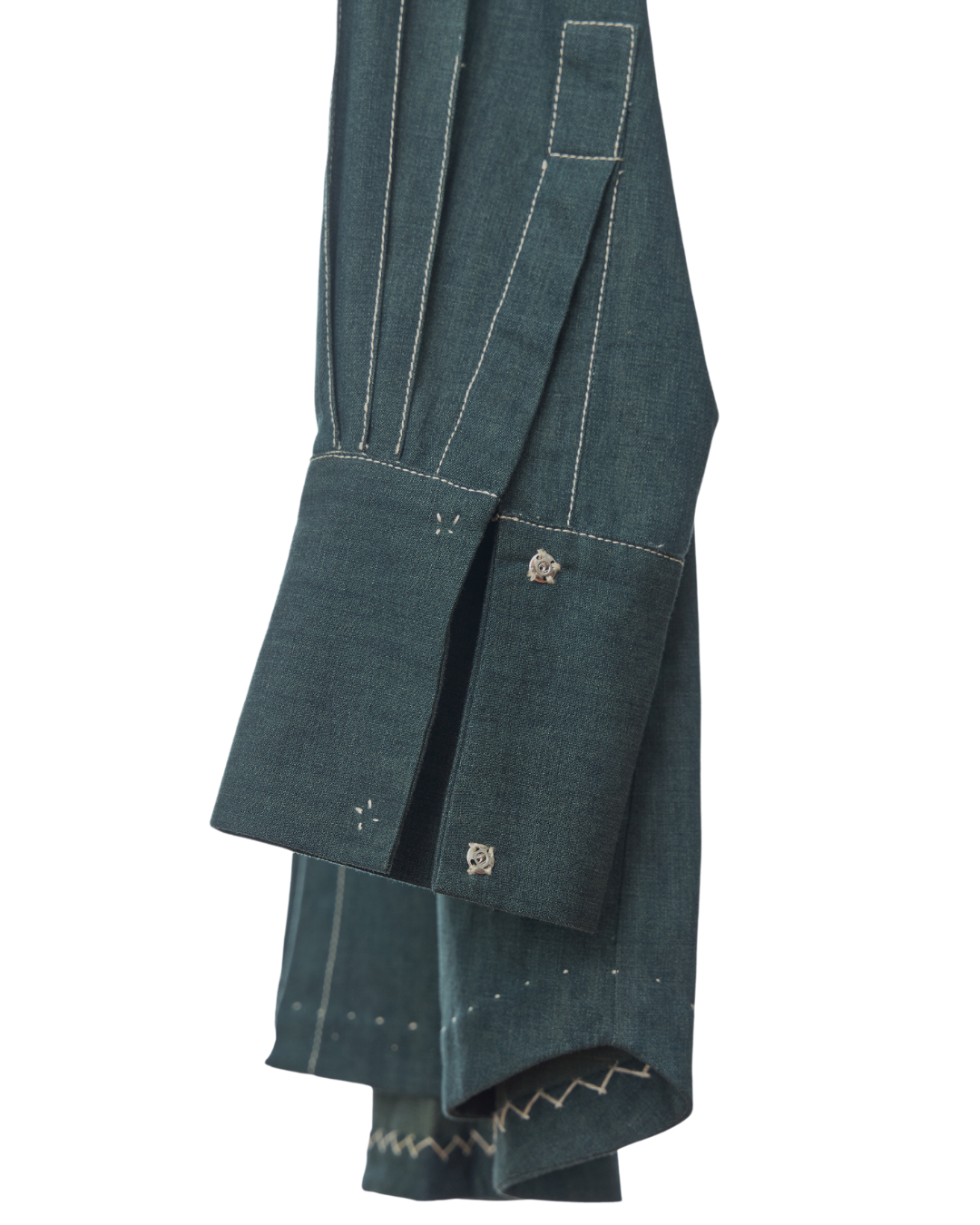 A long-sleeved shirt featuring a full front placket with snap closures, multi-pleated cuffs with visible topstitching for added detail, and a hand-sewn finish at the hem for understated refinement.