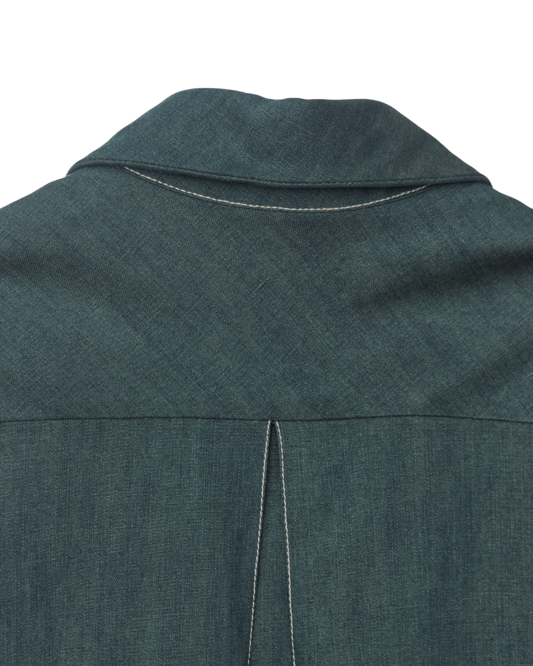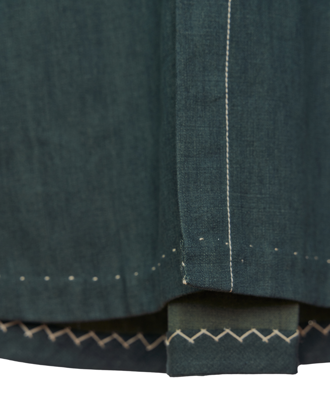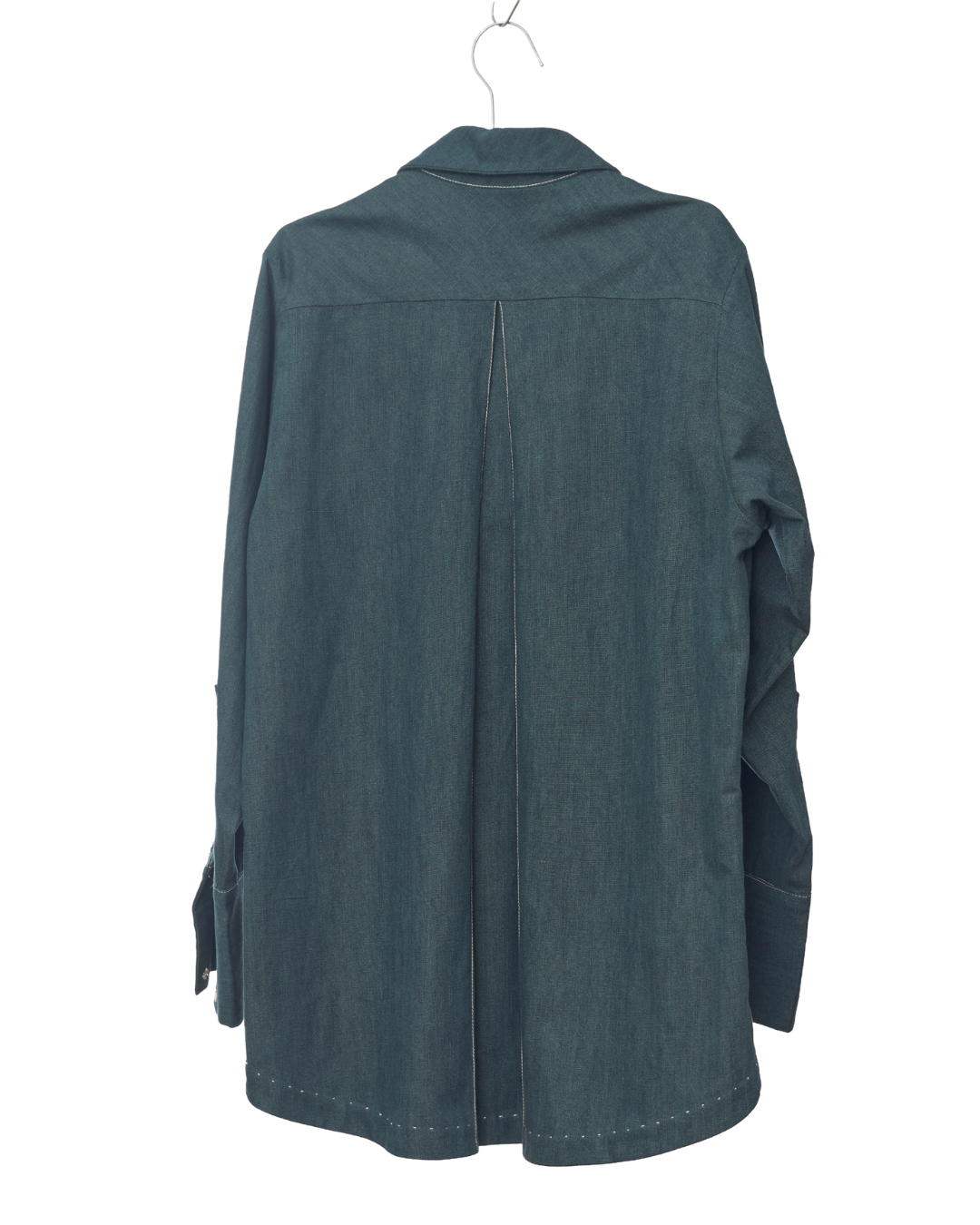 A long-sleeved shirt featuring a full front placket with snap closures, multi-pleated cuffs with visible topstitching for added detail, and a hand-sewn finish at the hem for understated refinement.