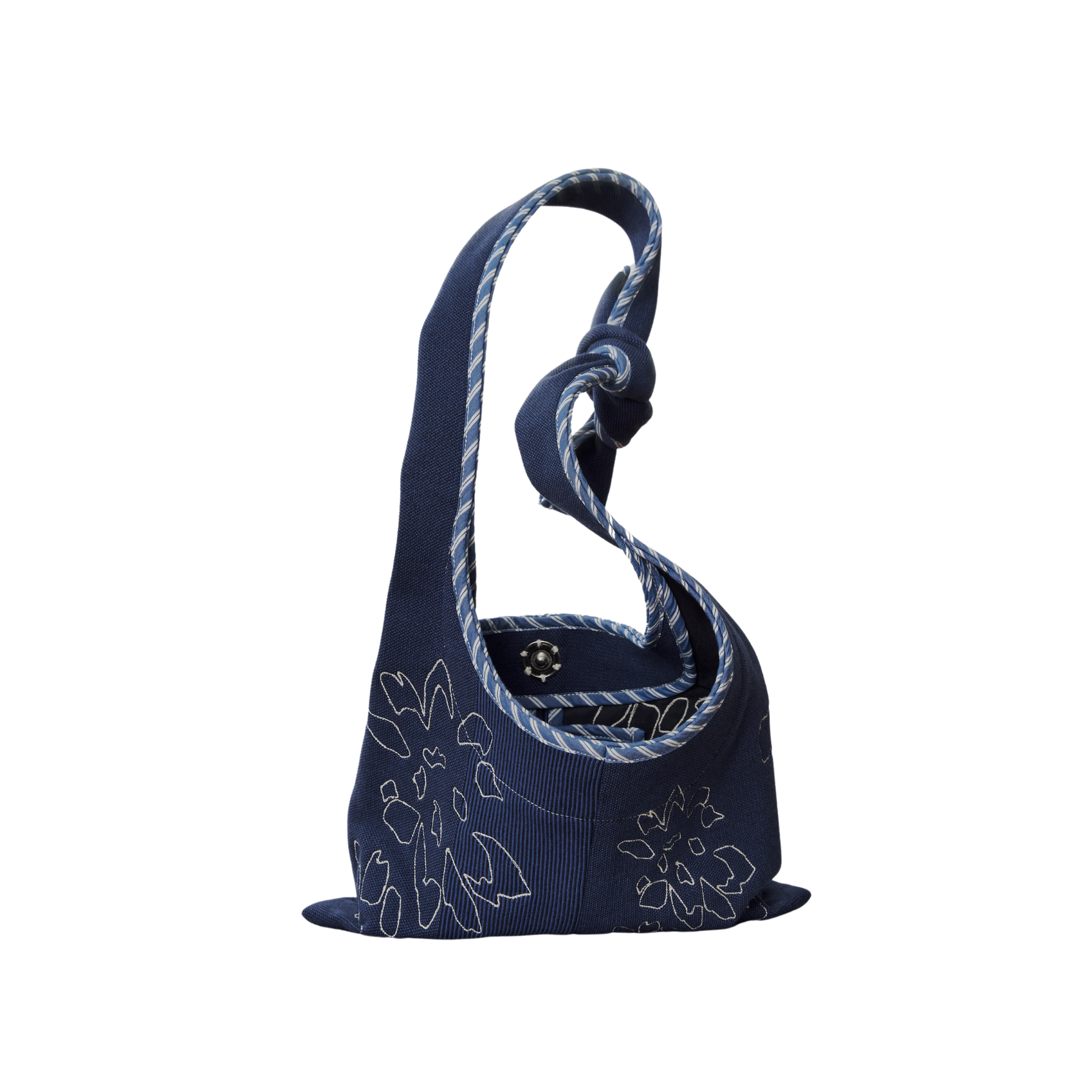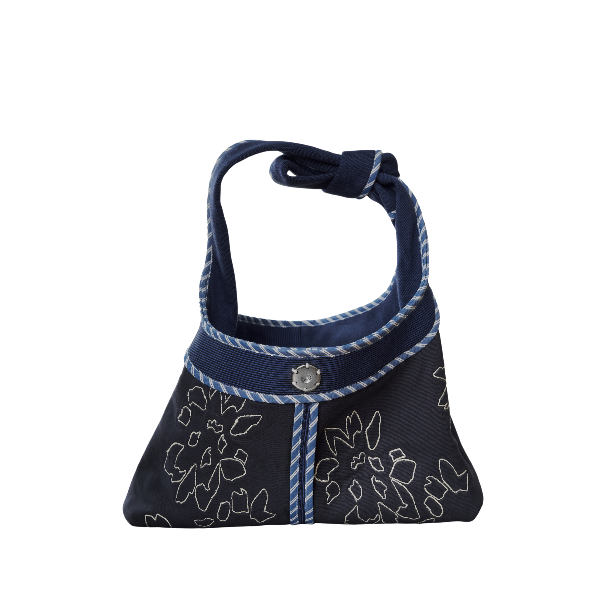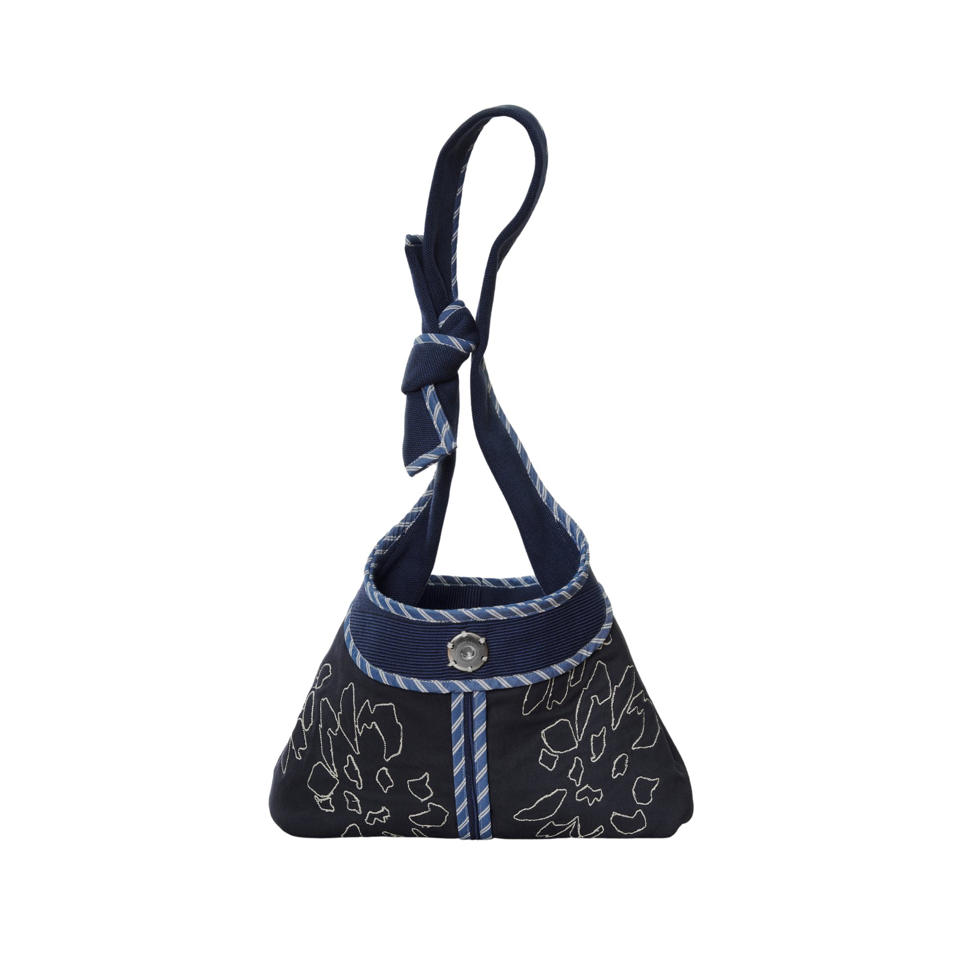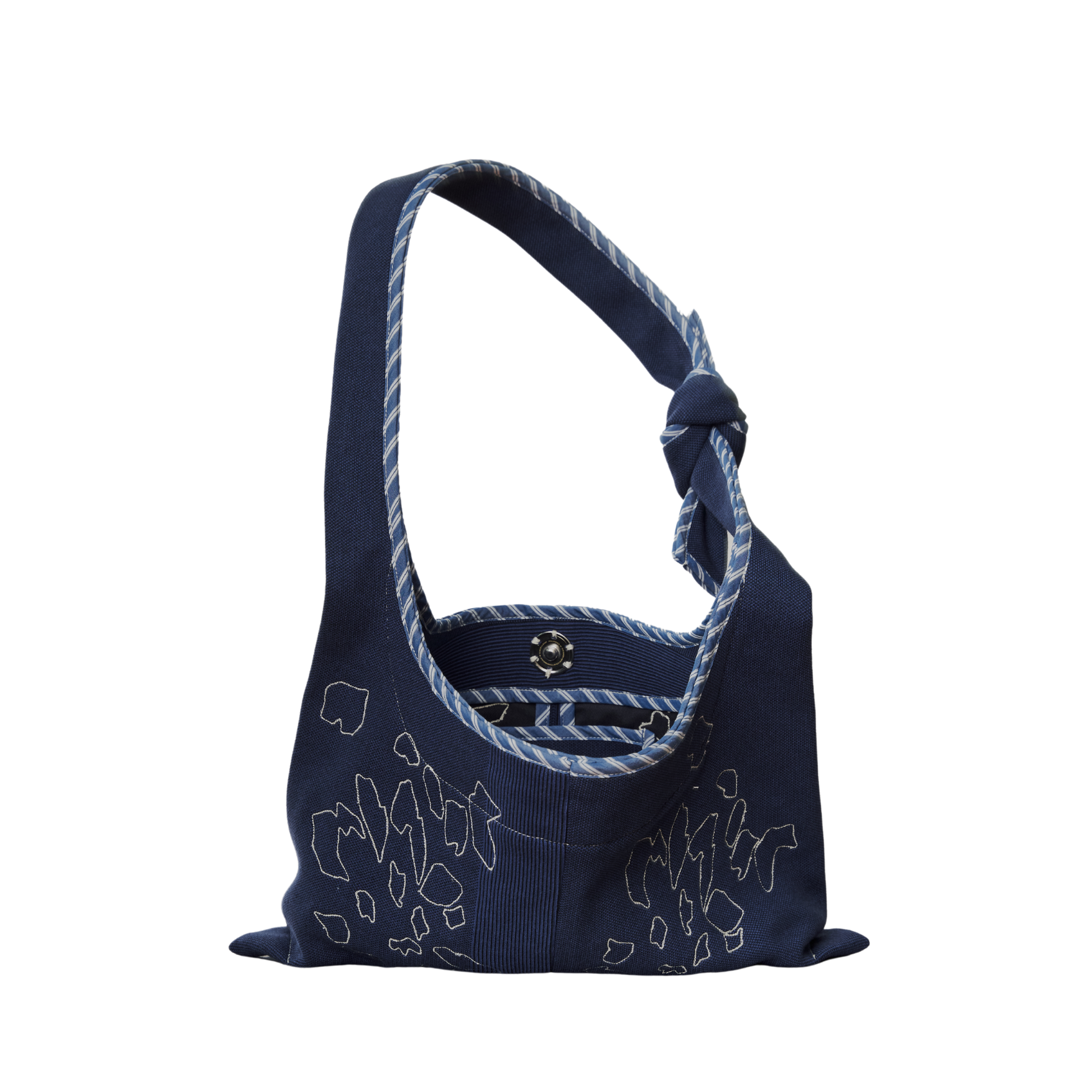 A relaxed hobo bag with a slouchy form made in rib, twill, and poplin featuring a single snap closure and ties as handles.