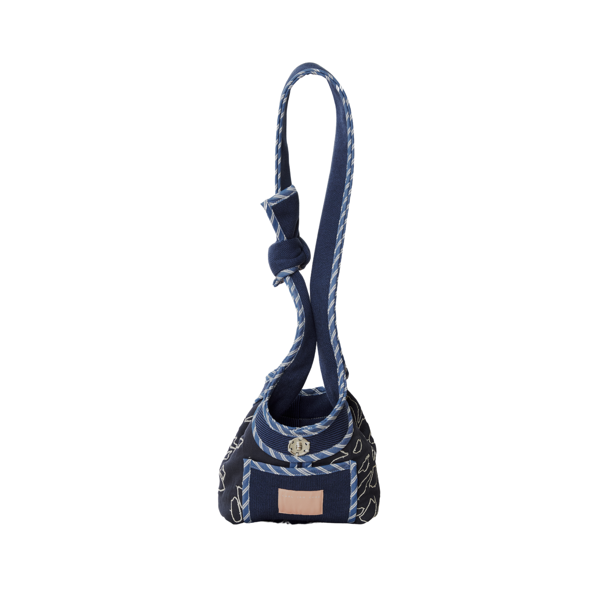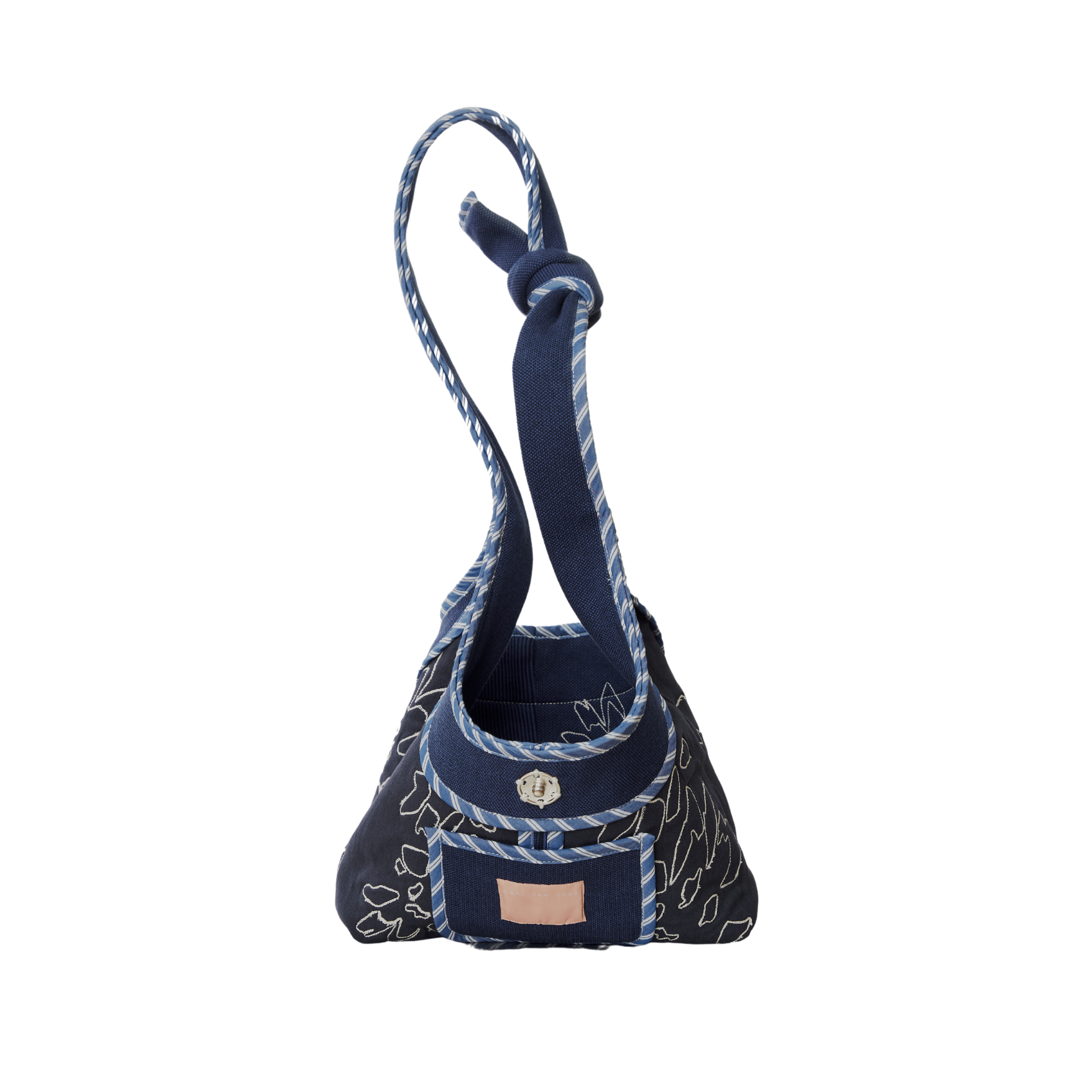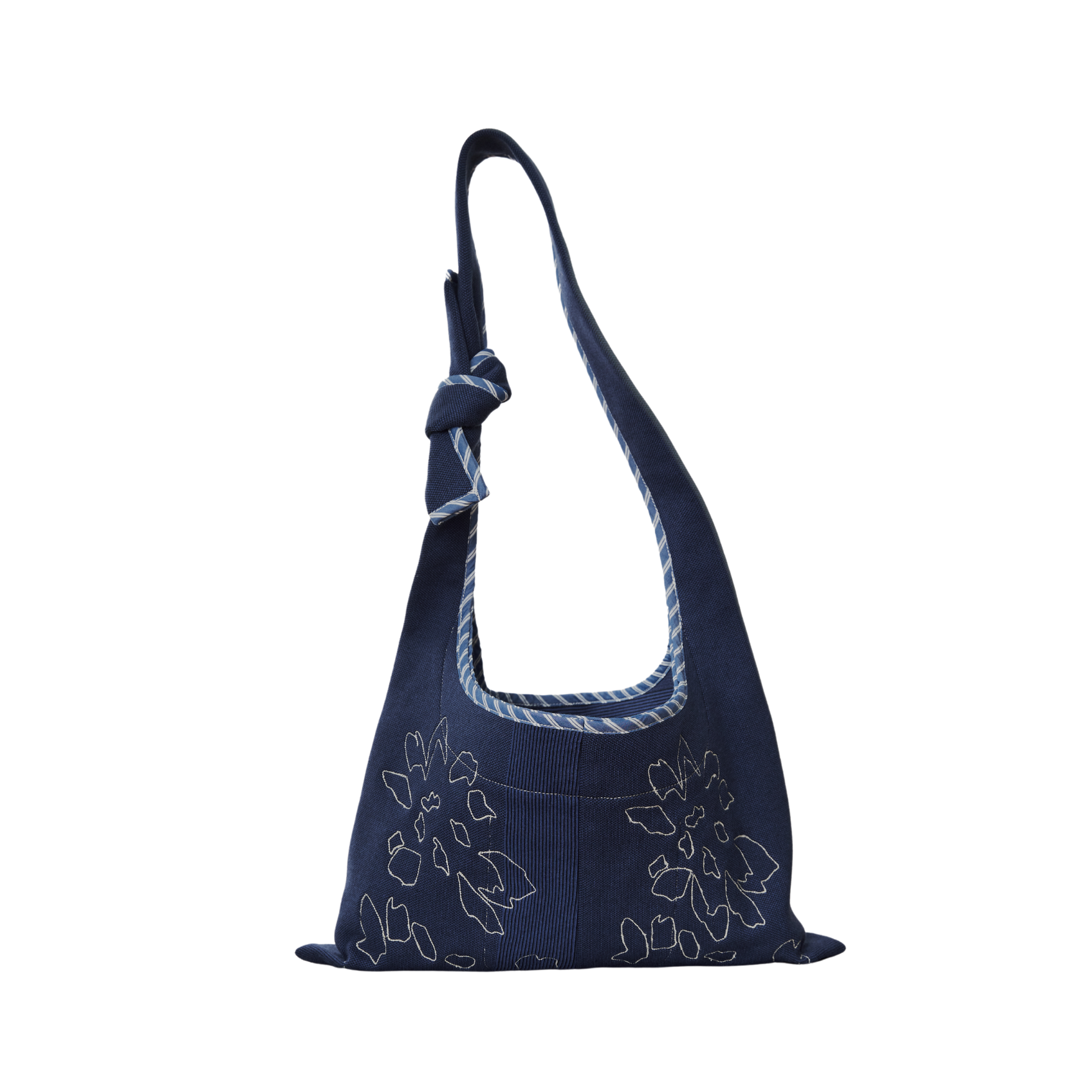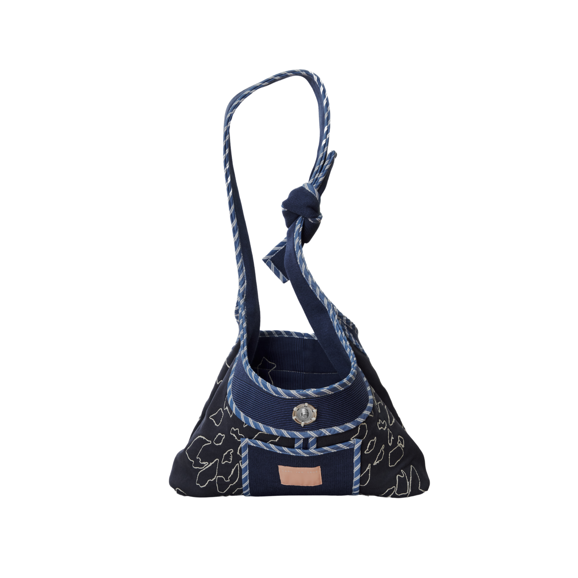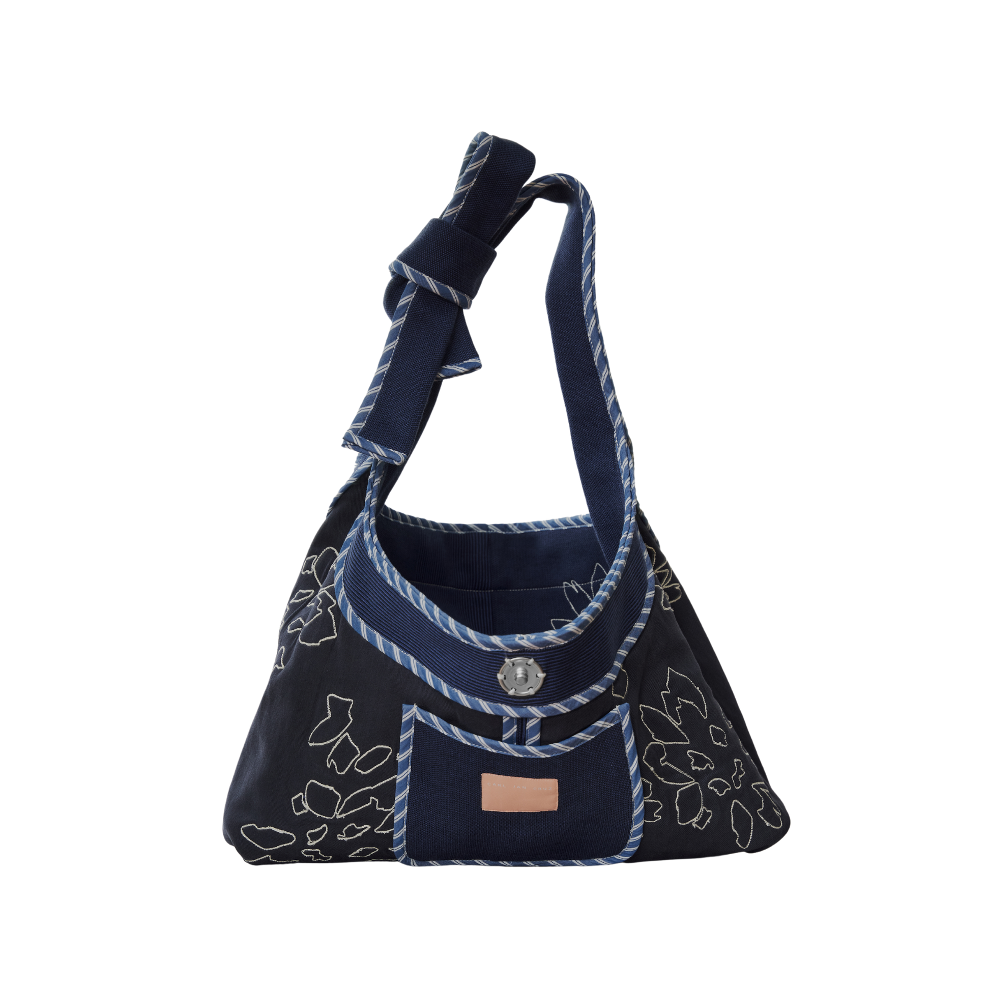 A relaxed hobo bag with a slouchy form made in rib, twill, and poplin featuring a single snap closure and ties as handles.