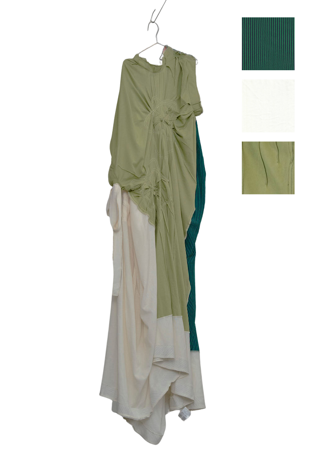 An abstract dress in gathered quilted pique with asymmetrical sleeves and drawstrings for playfulness and flexibility.