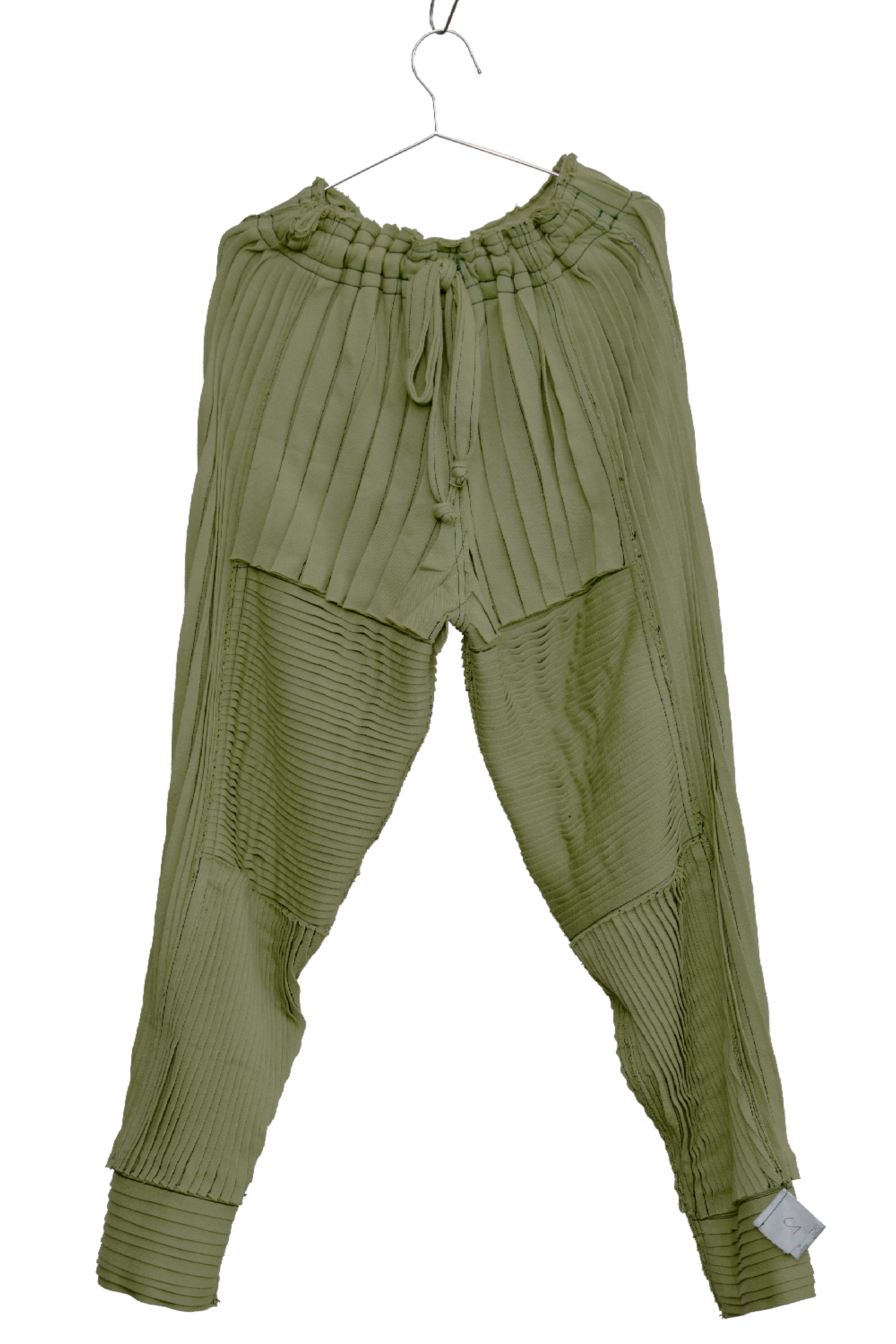 Jogger-style trousers in pleated and pressed pique with a drawstring closure. Hem may be cuffed according to the wearer's preference.