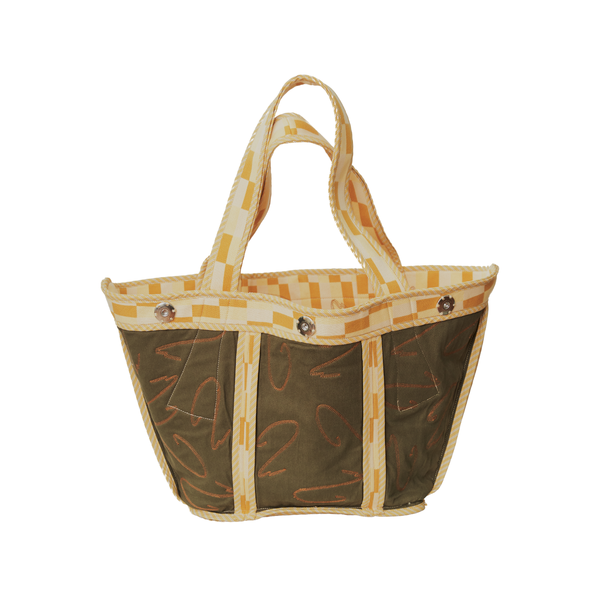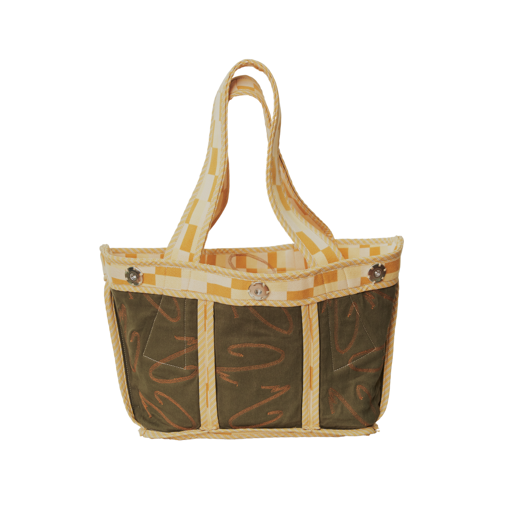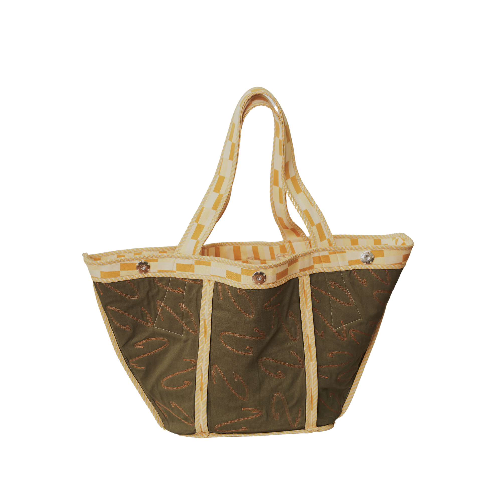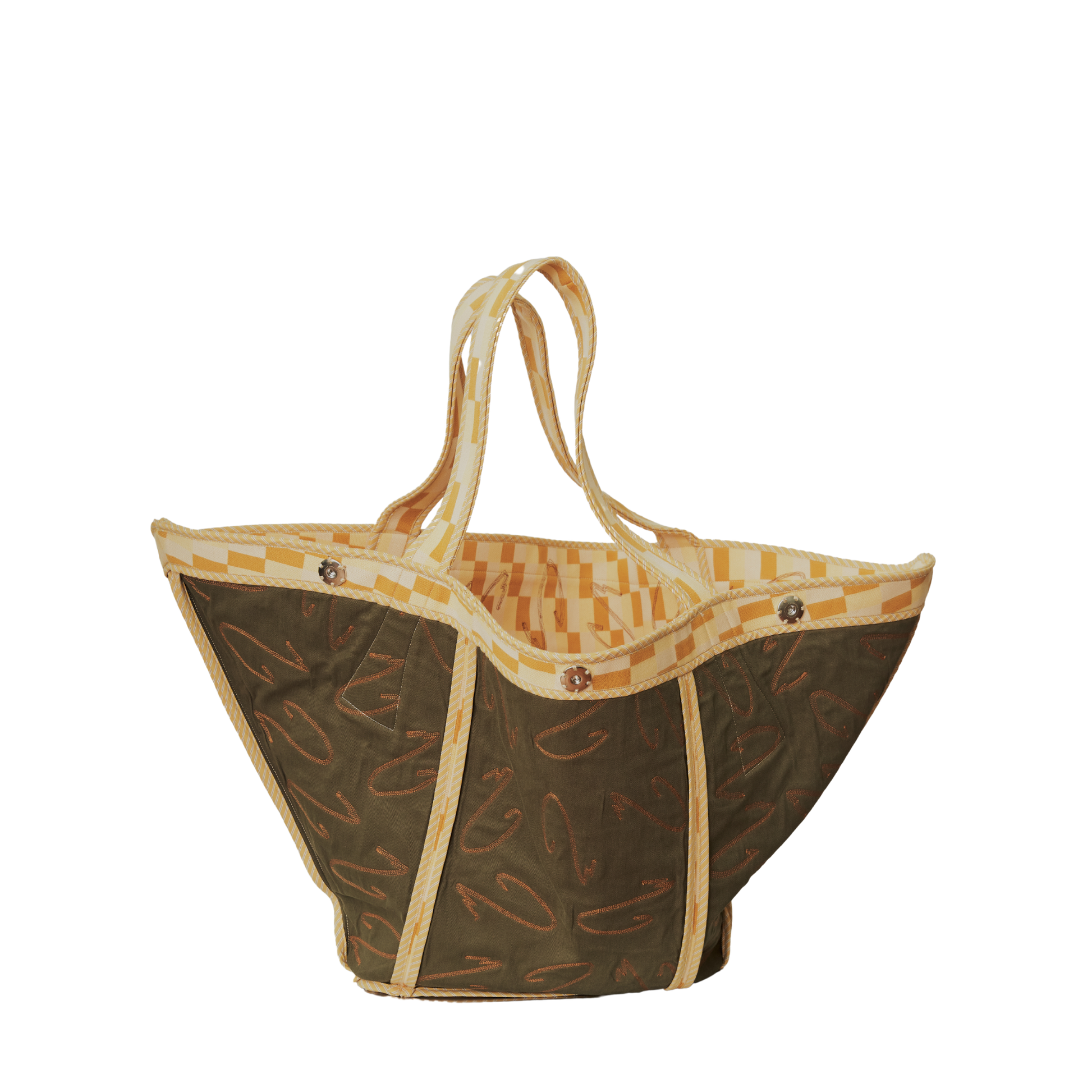 A baguette-shaped basket bag in rib, twill, and poplin with a bag strap and snaps to close.