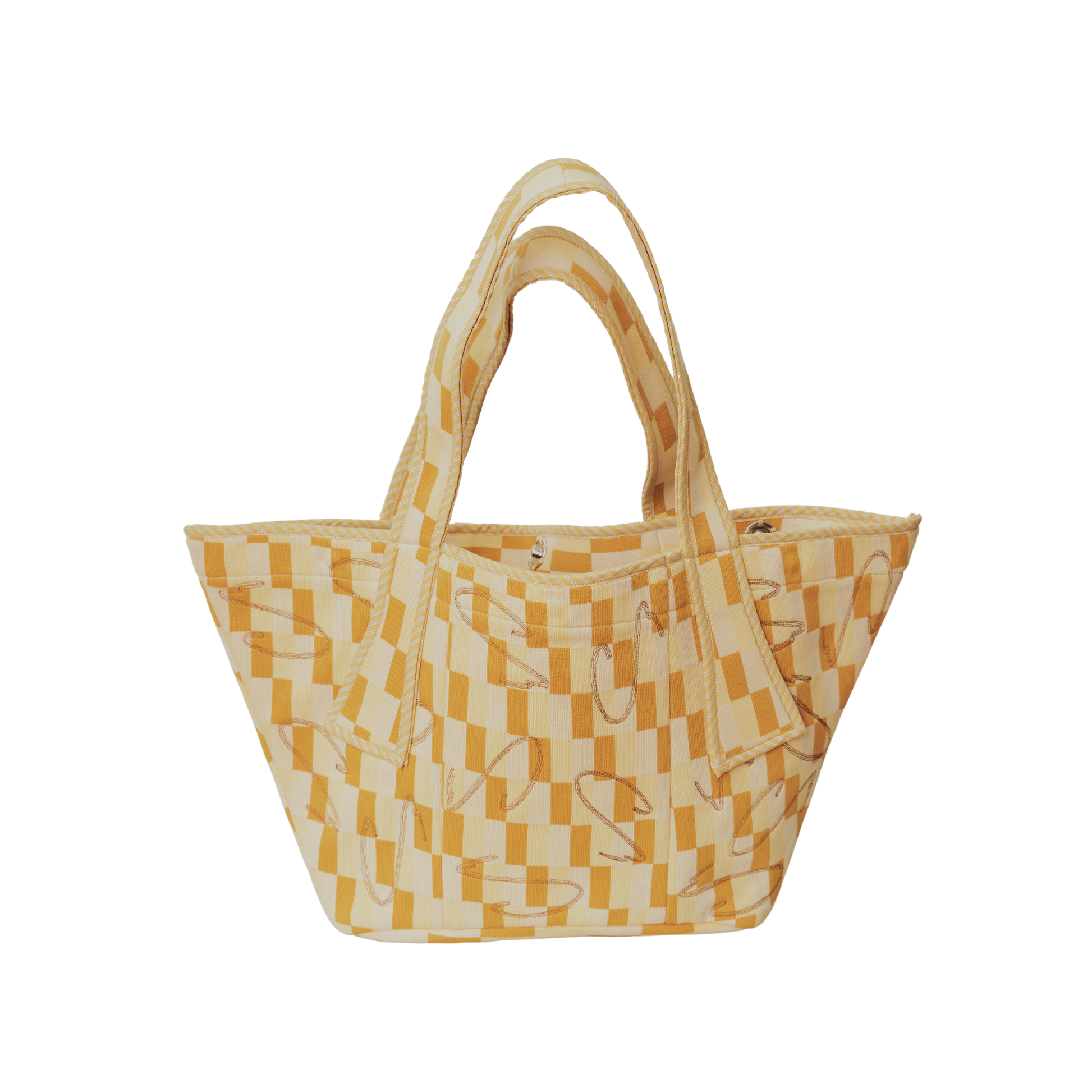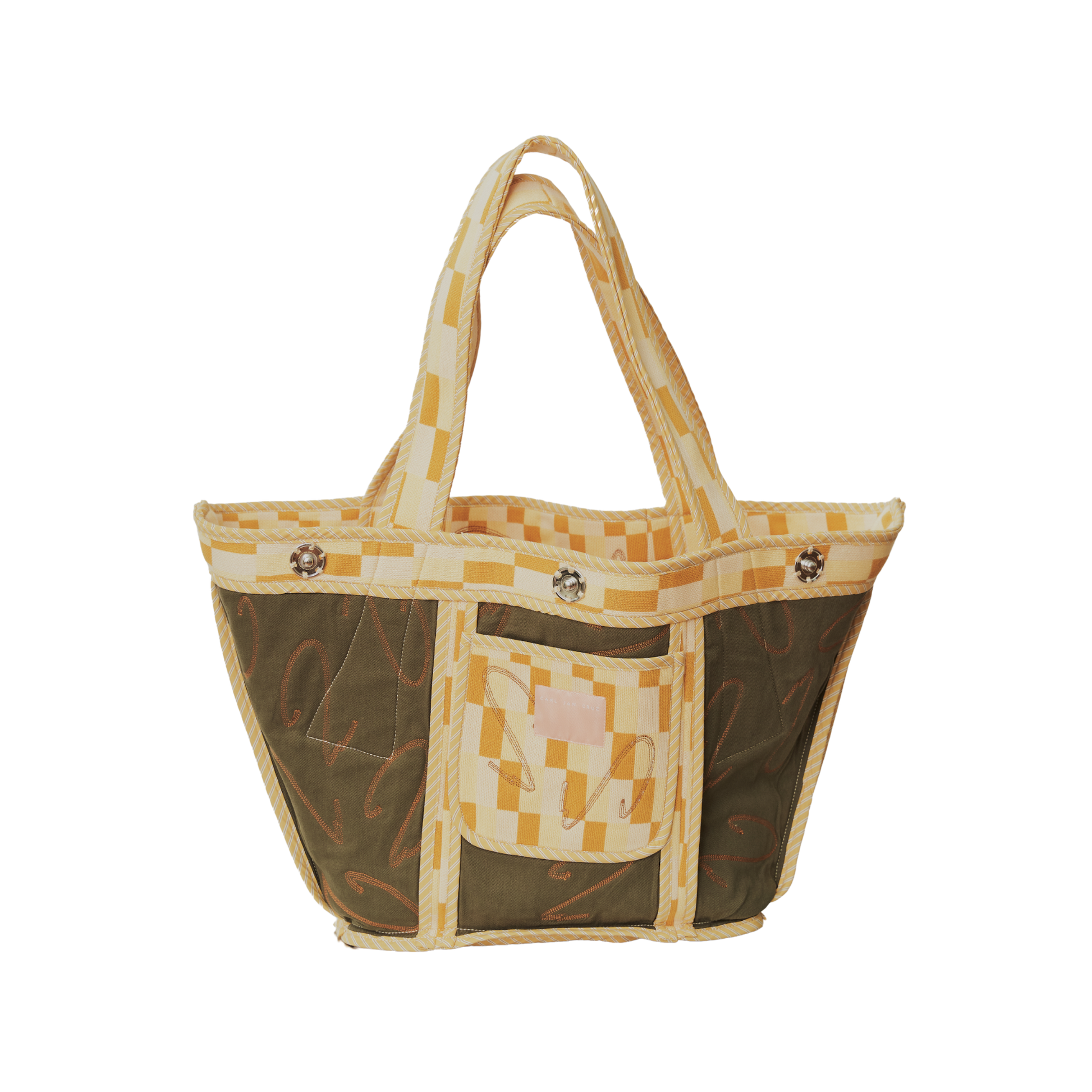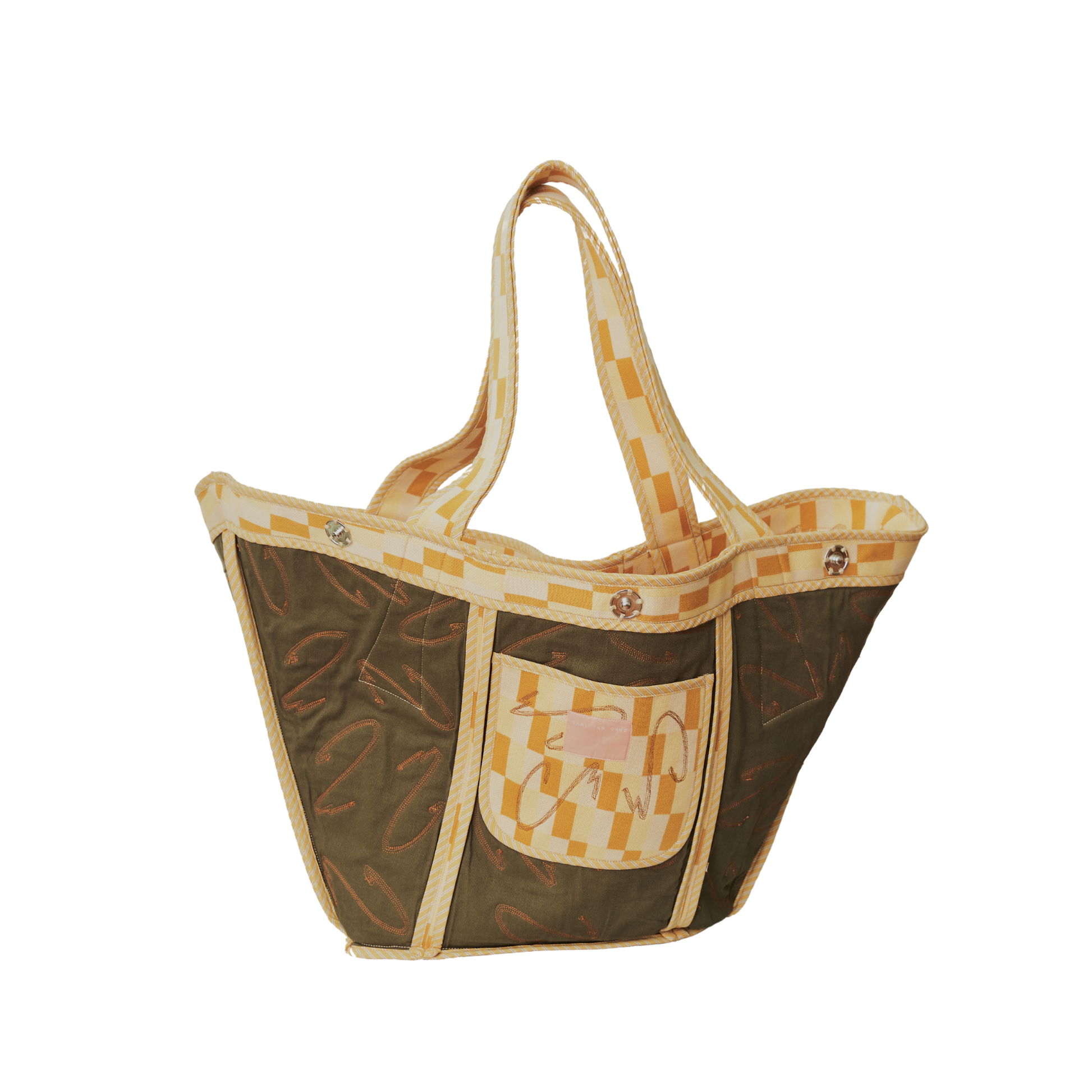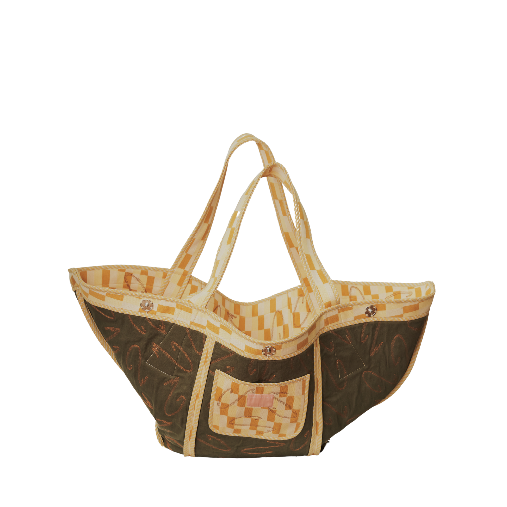 A baguette-shaped basket bag in rib, twill, and poplin with a bag strap and snaps to close.