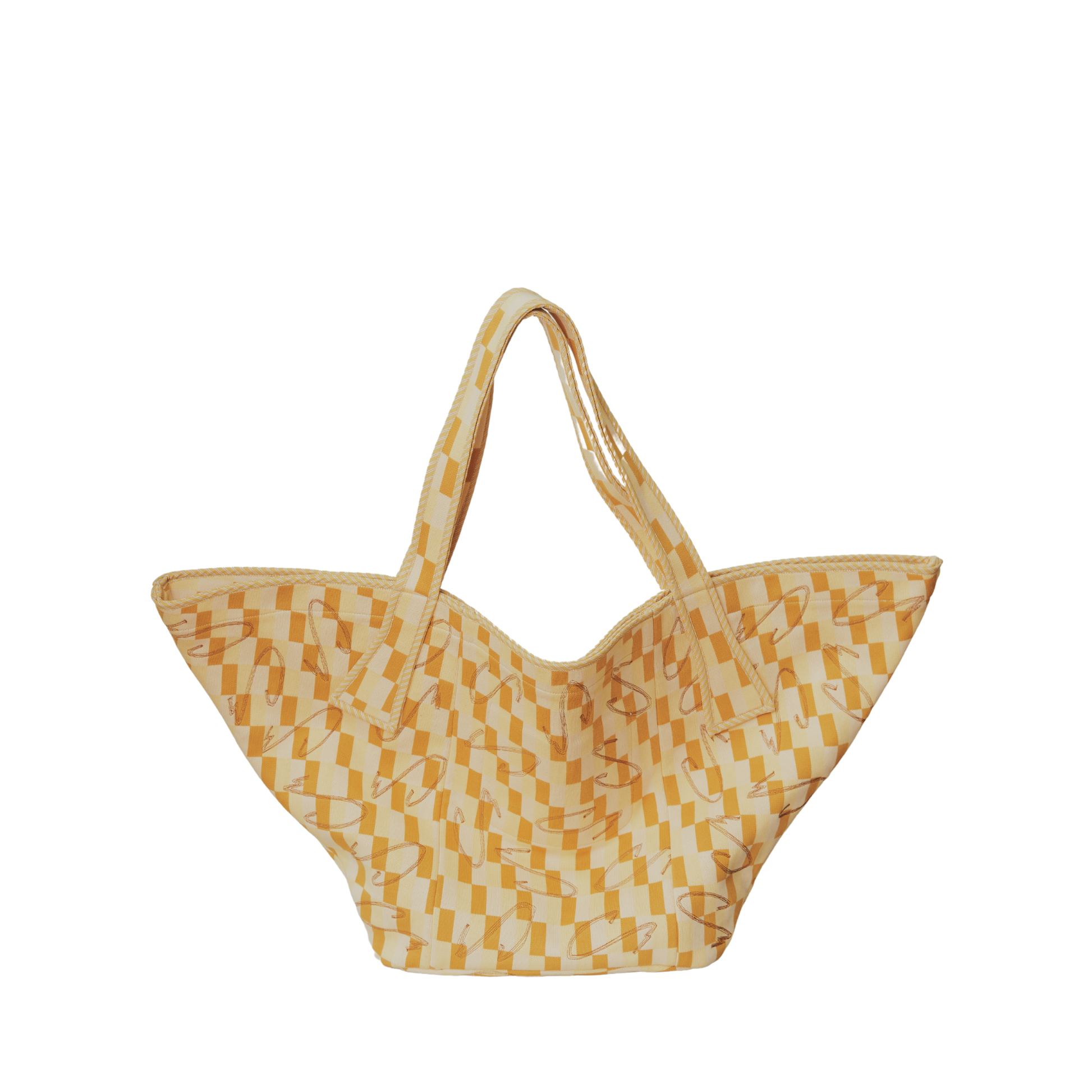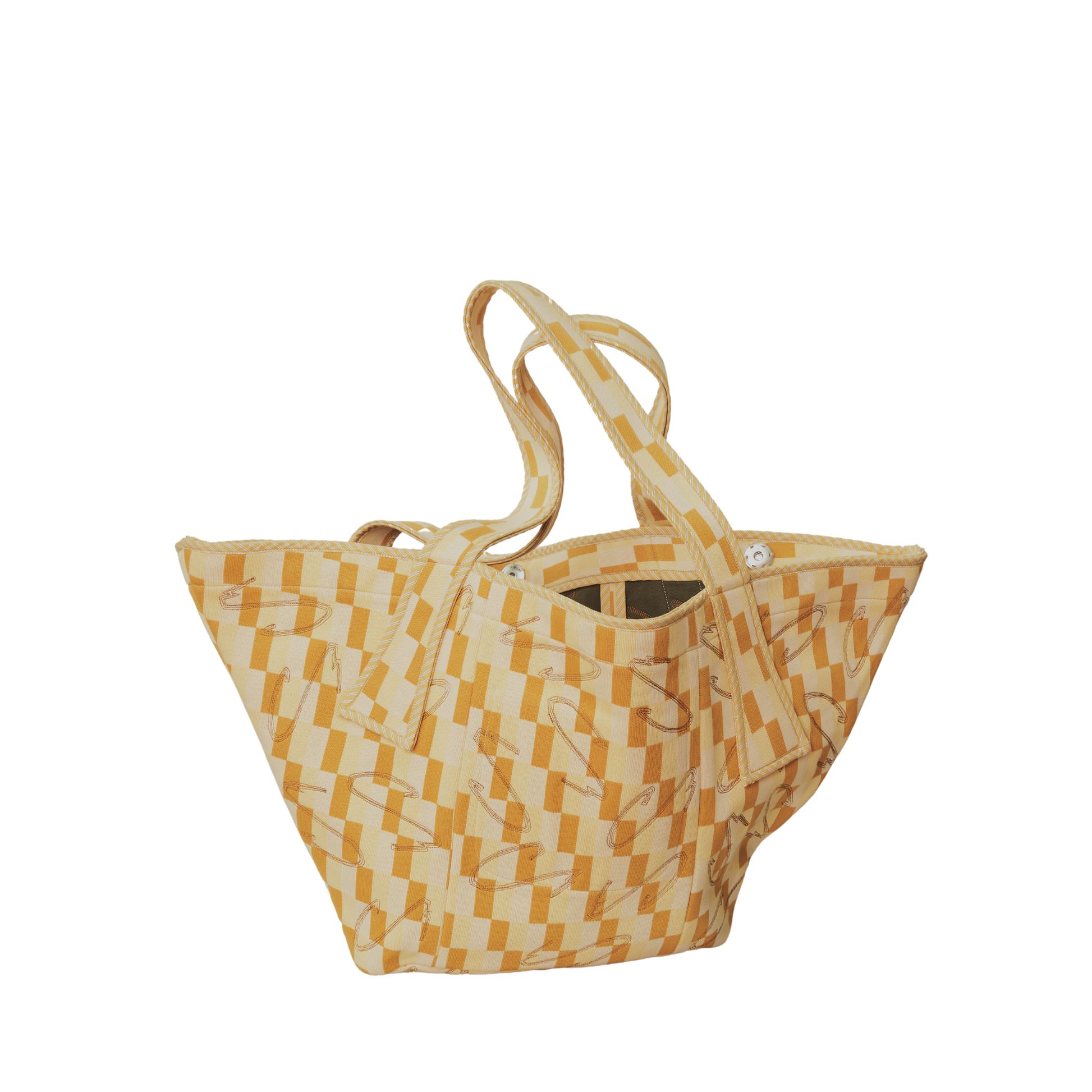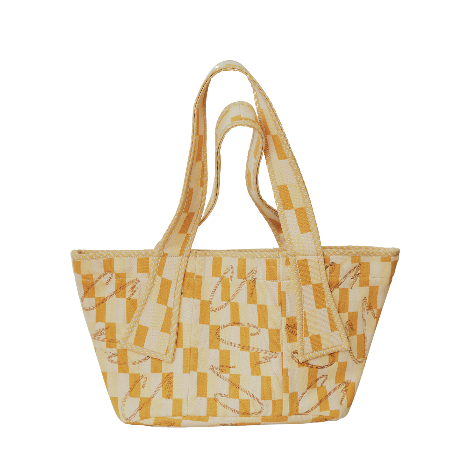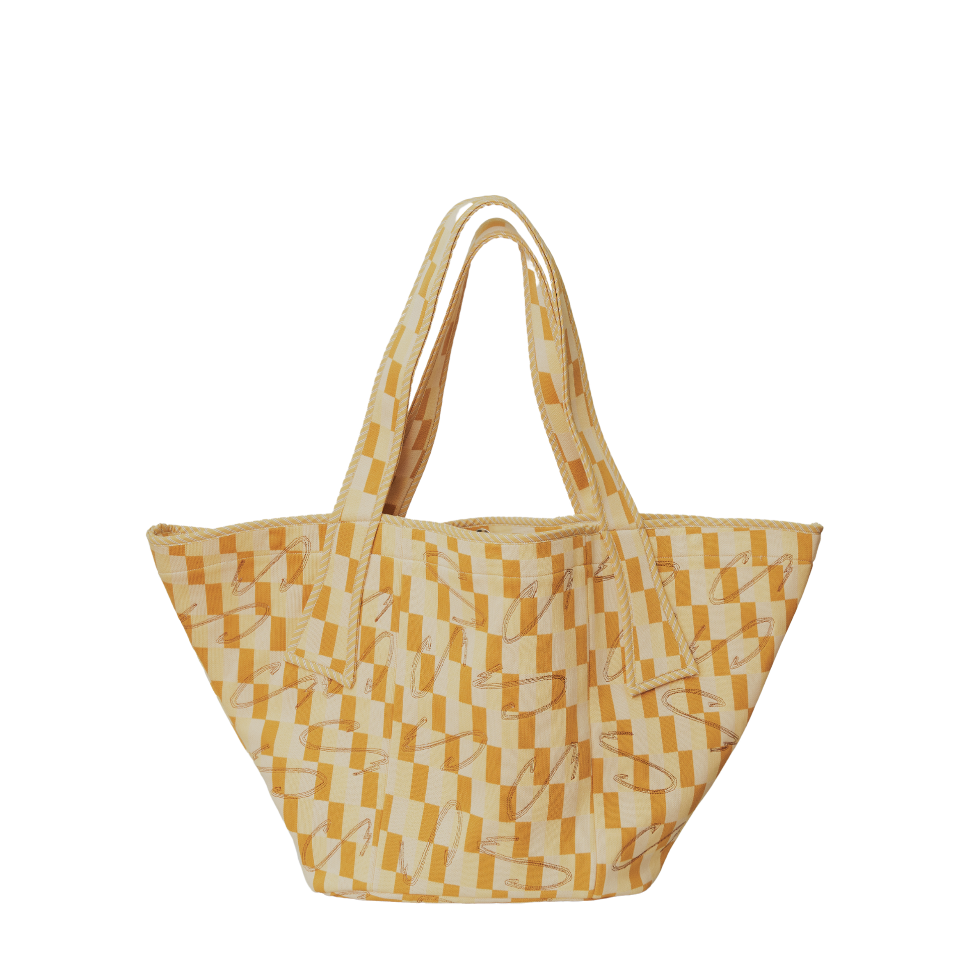A baguette-shaped basket bag in rib, twill, and poplin with a bag strap and snaps to close.