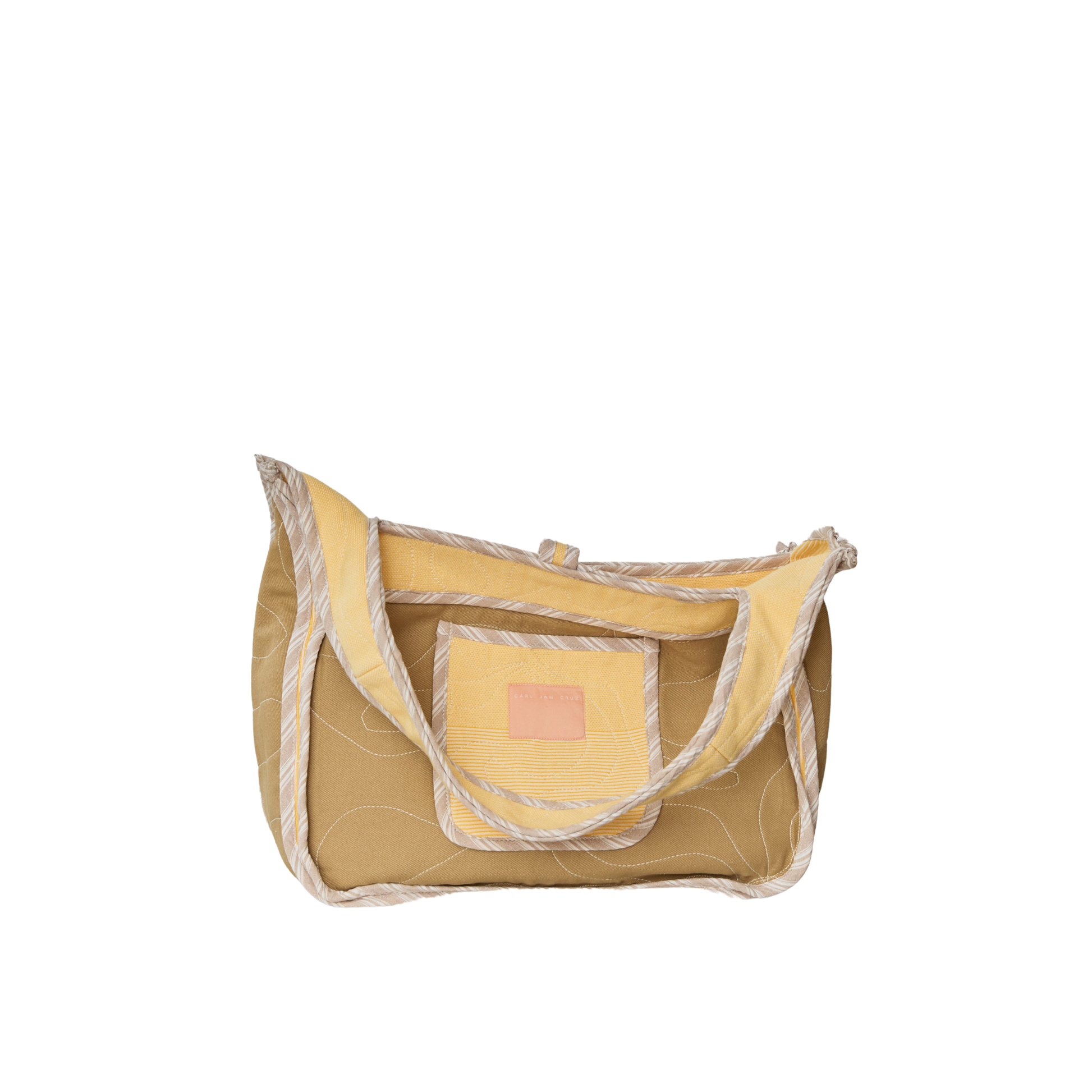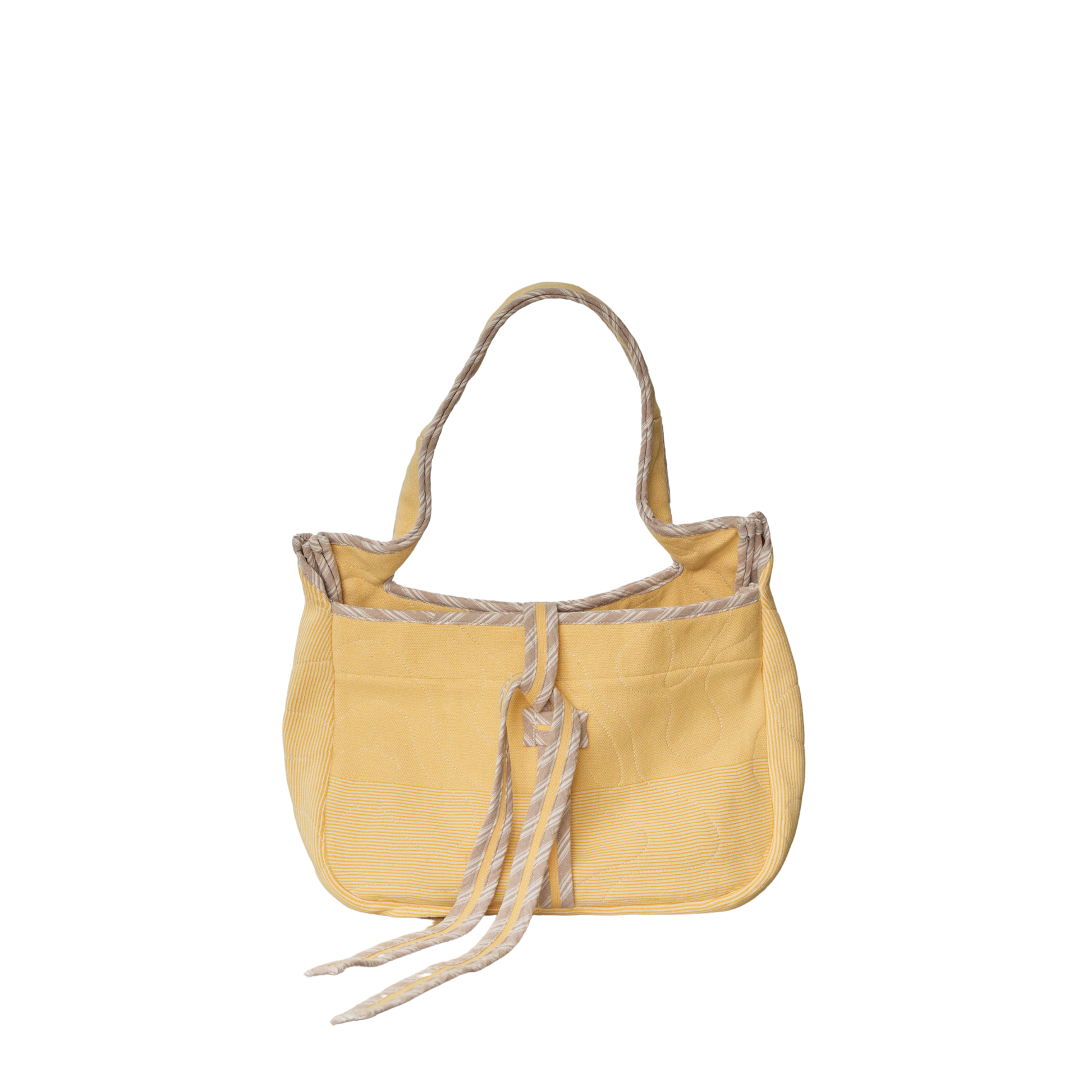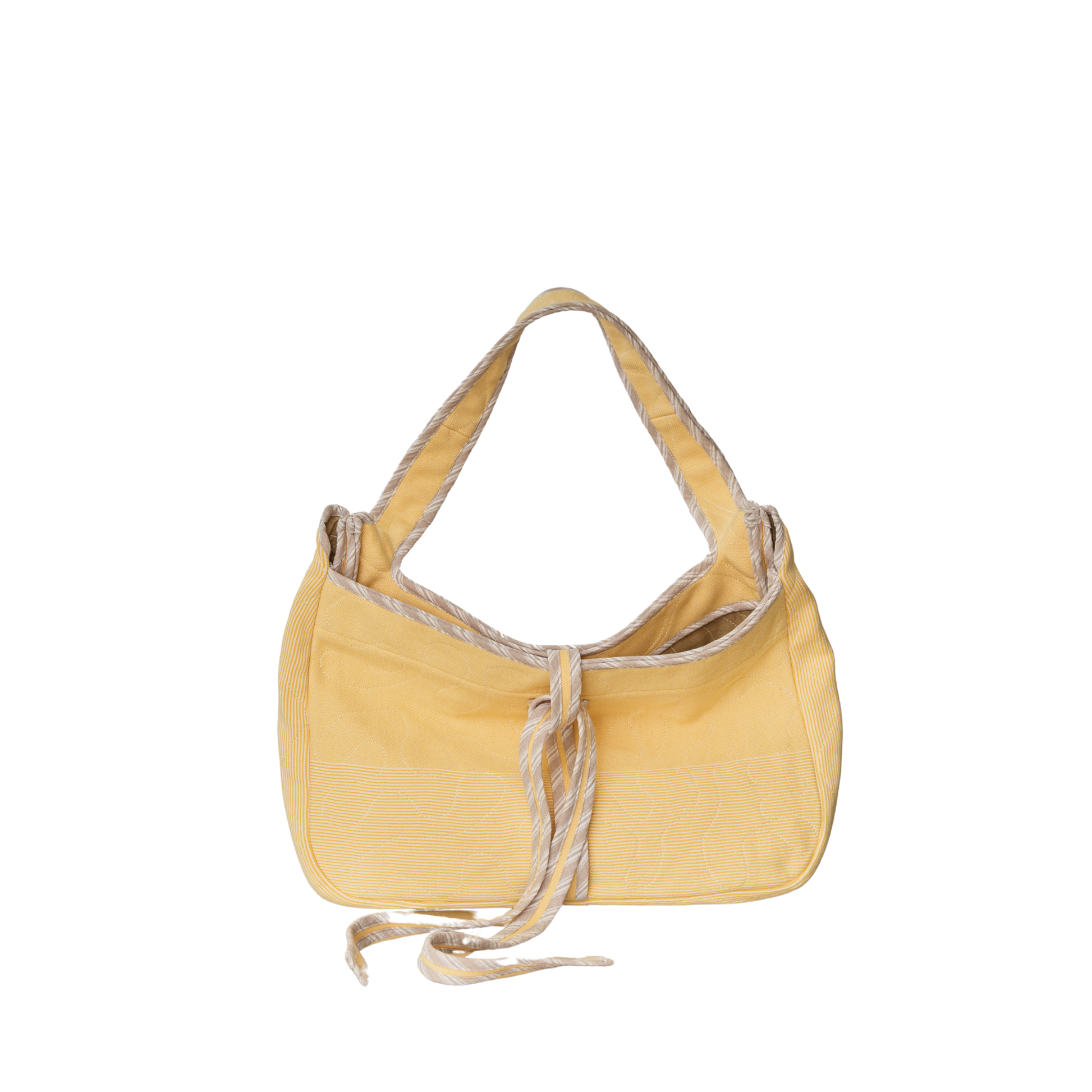 A placemat-shaped bag in rib, twill, and poplin featuring ties to secure the slashed opening, providing easy access to its contents.