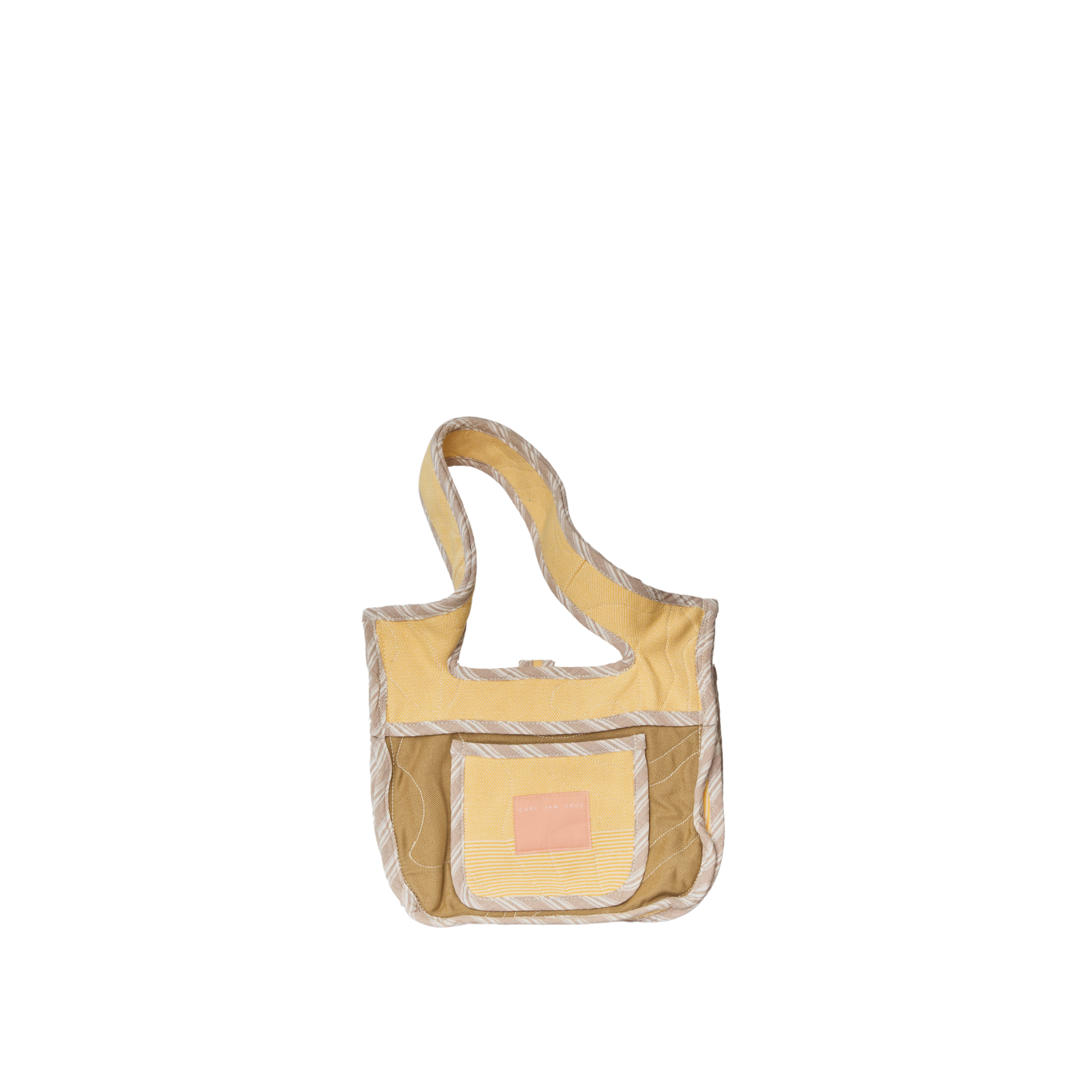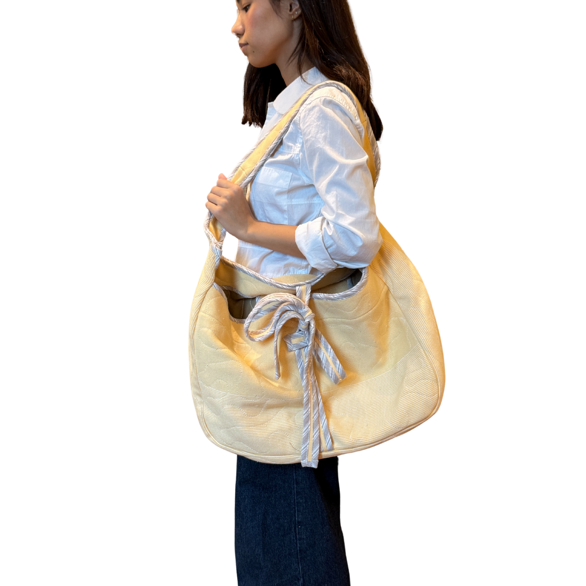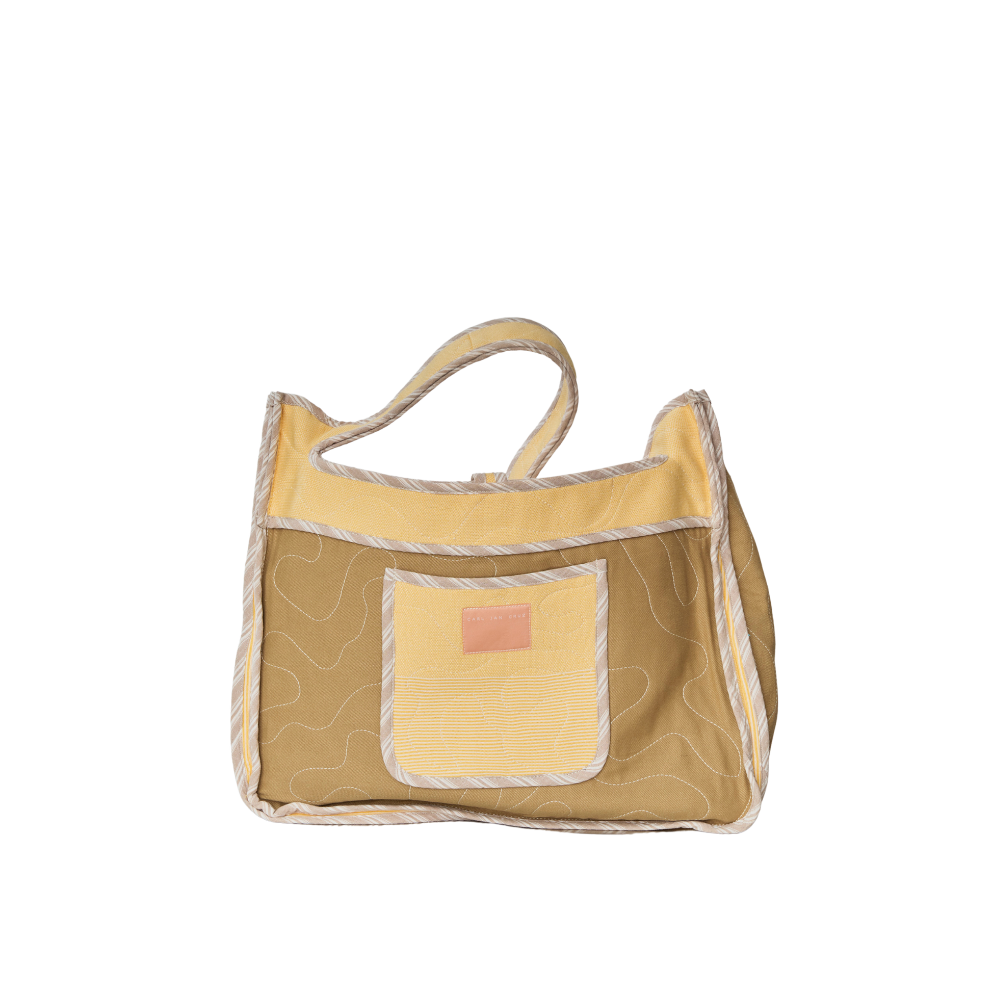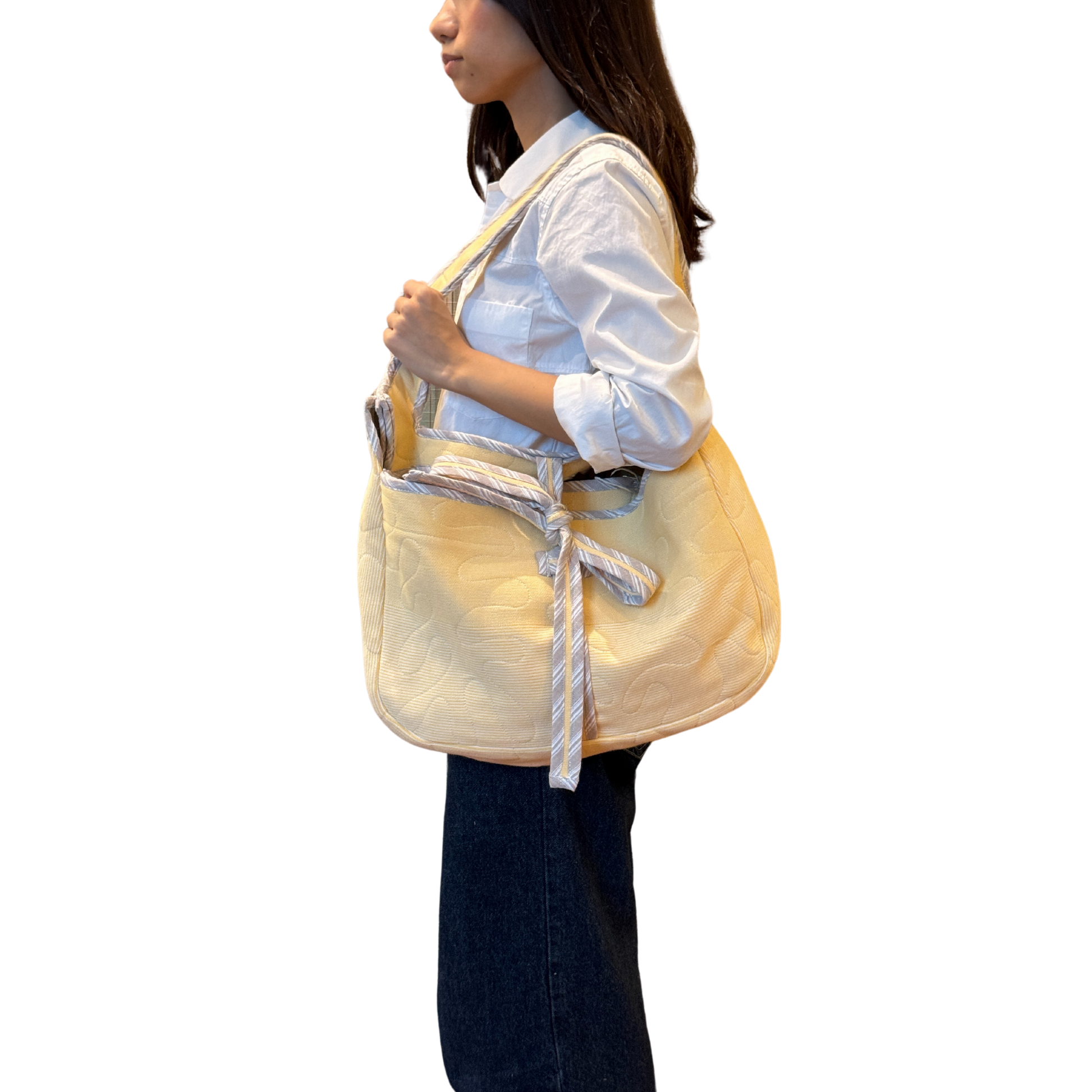 A placemat-shaped bag in rib, twill, and poplin featuring ties to secure the slashed opening, providing easy access to its contents.