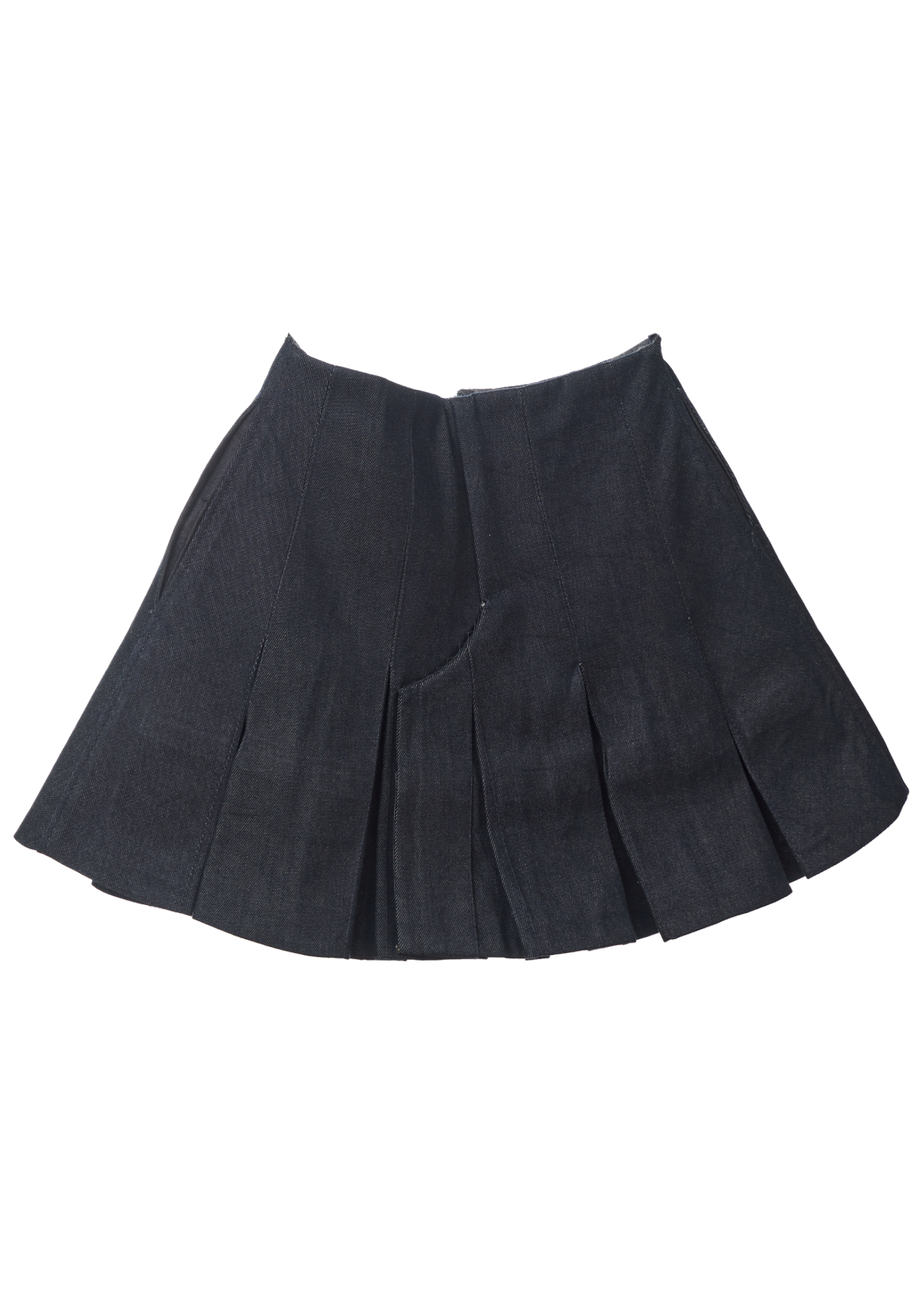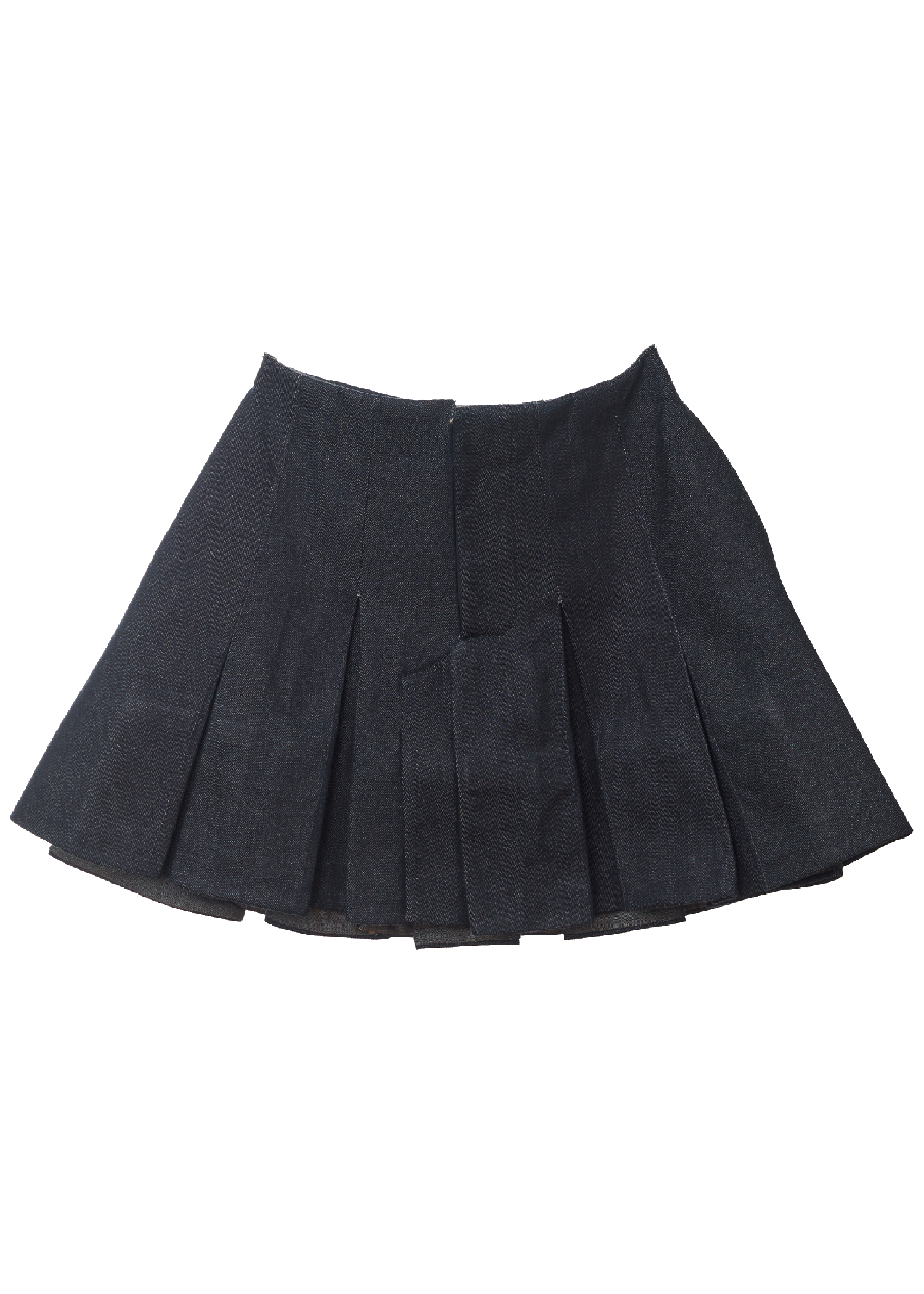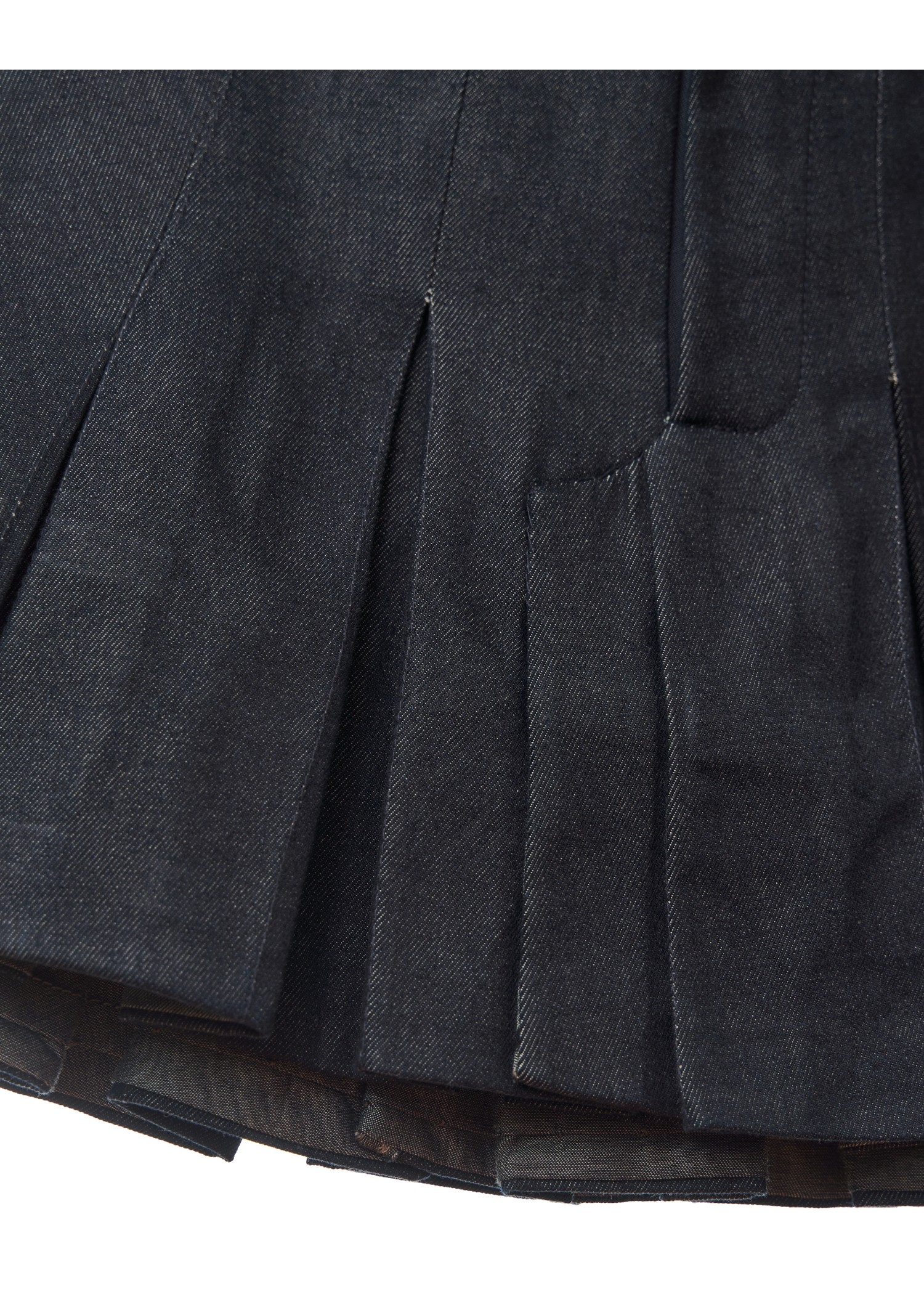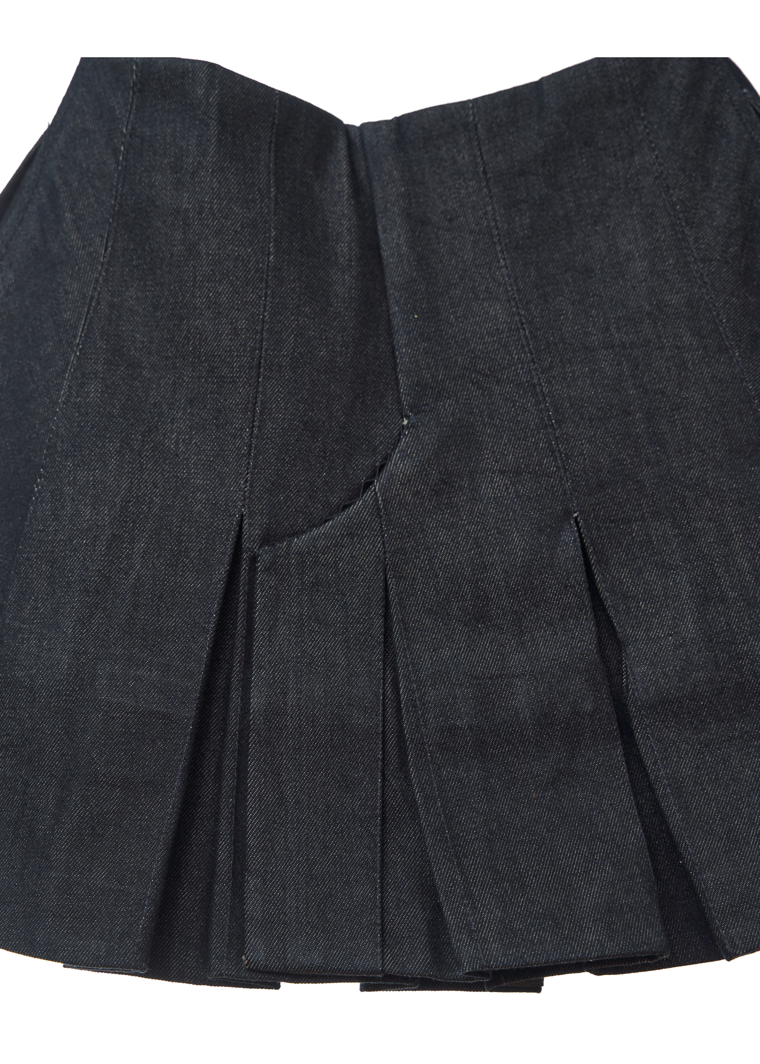 A pleated mini skirt in Edition 0 denim that provides structure and form, secured with a hook & eye closure, and zipper.